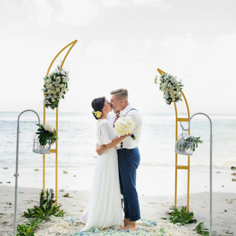 [Unique Design]---This is a creative wedding backdrop stand with a unique curved top design. This gold half-moon Wedding Arch consists of two arches of different heights with a semi-open design for spatial flexibility, allowing you to adjust the position of the curved top wedding arch frame to your liking. Each arch is designed with short sections, greatly reducing storage space for easy transport and storage, suitable for both indoor and outdoor use.