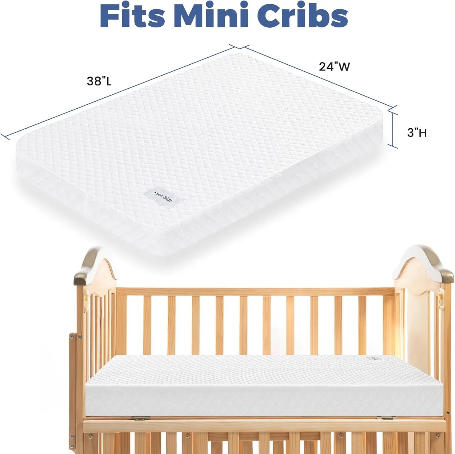 - [Universal Size] The 38’’x24’’x3’’ baby mattress perfectly fits most mini cribs and portable cribs. (Note: not designed for standard cribs or pack and play). Please measure your crib first before order to ensure a perfect fit