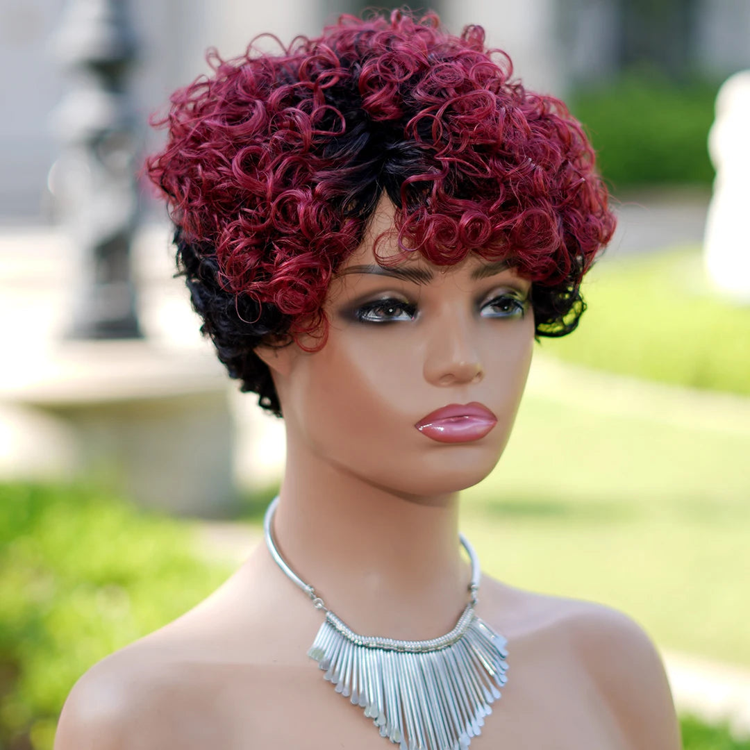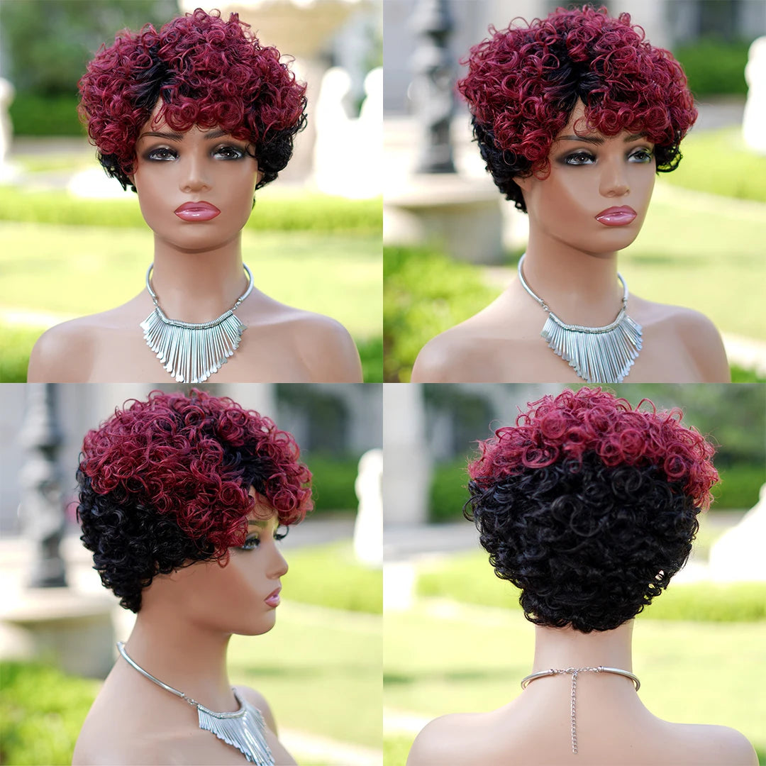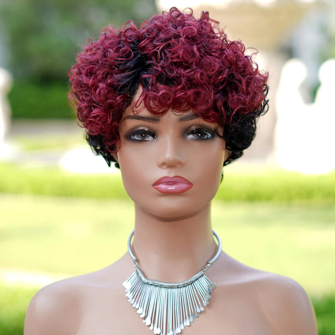 6inch Short Curly Wigs T1B/99J None Lace Front Human Hair Wigs with Bangs 180% Density Machine Made Pixie Cut Curly Wave Wig