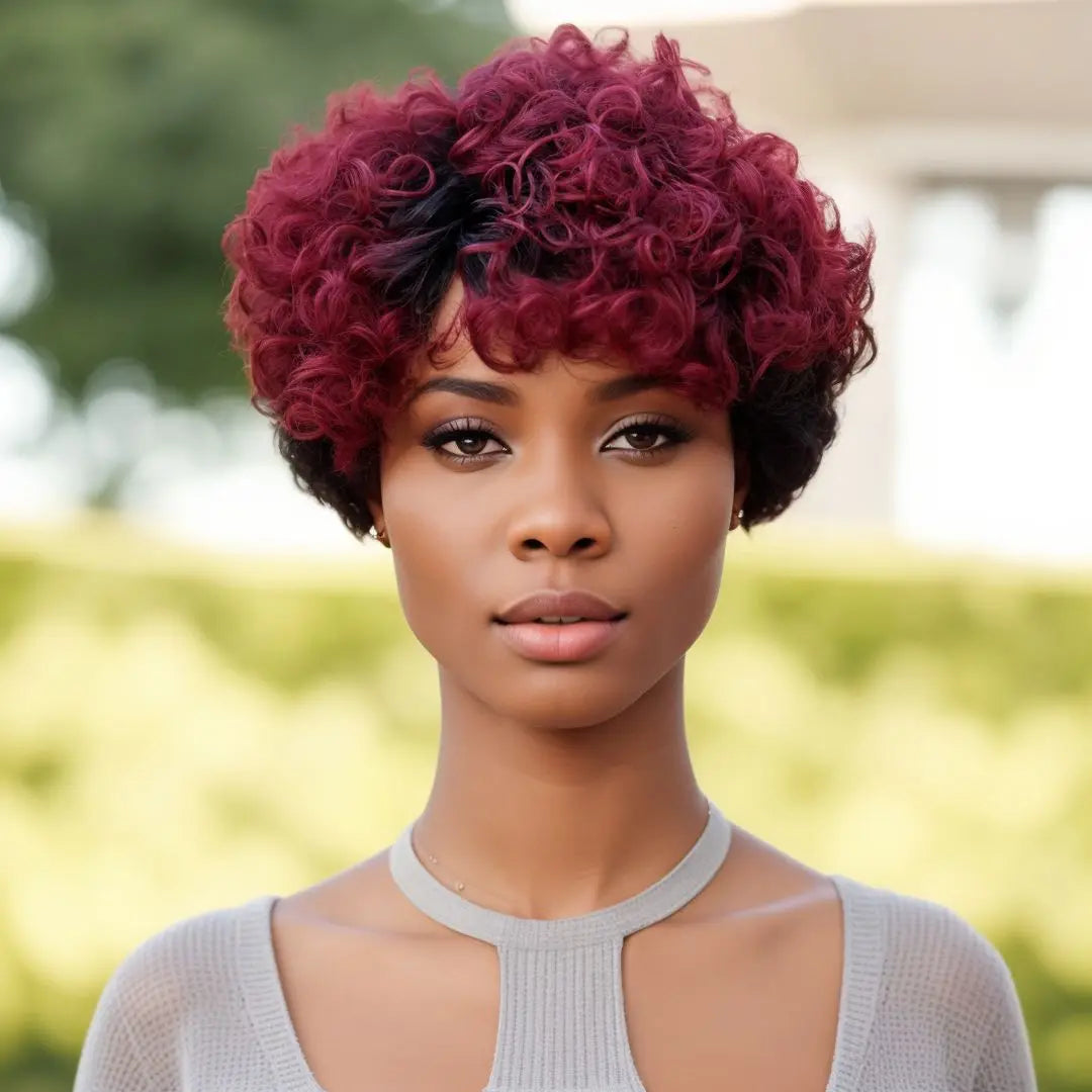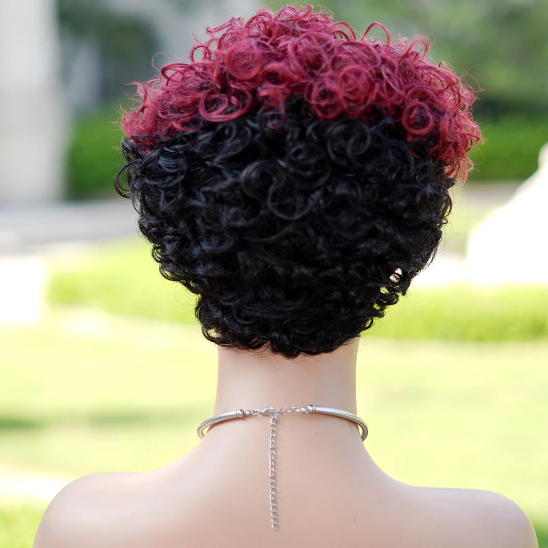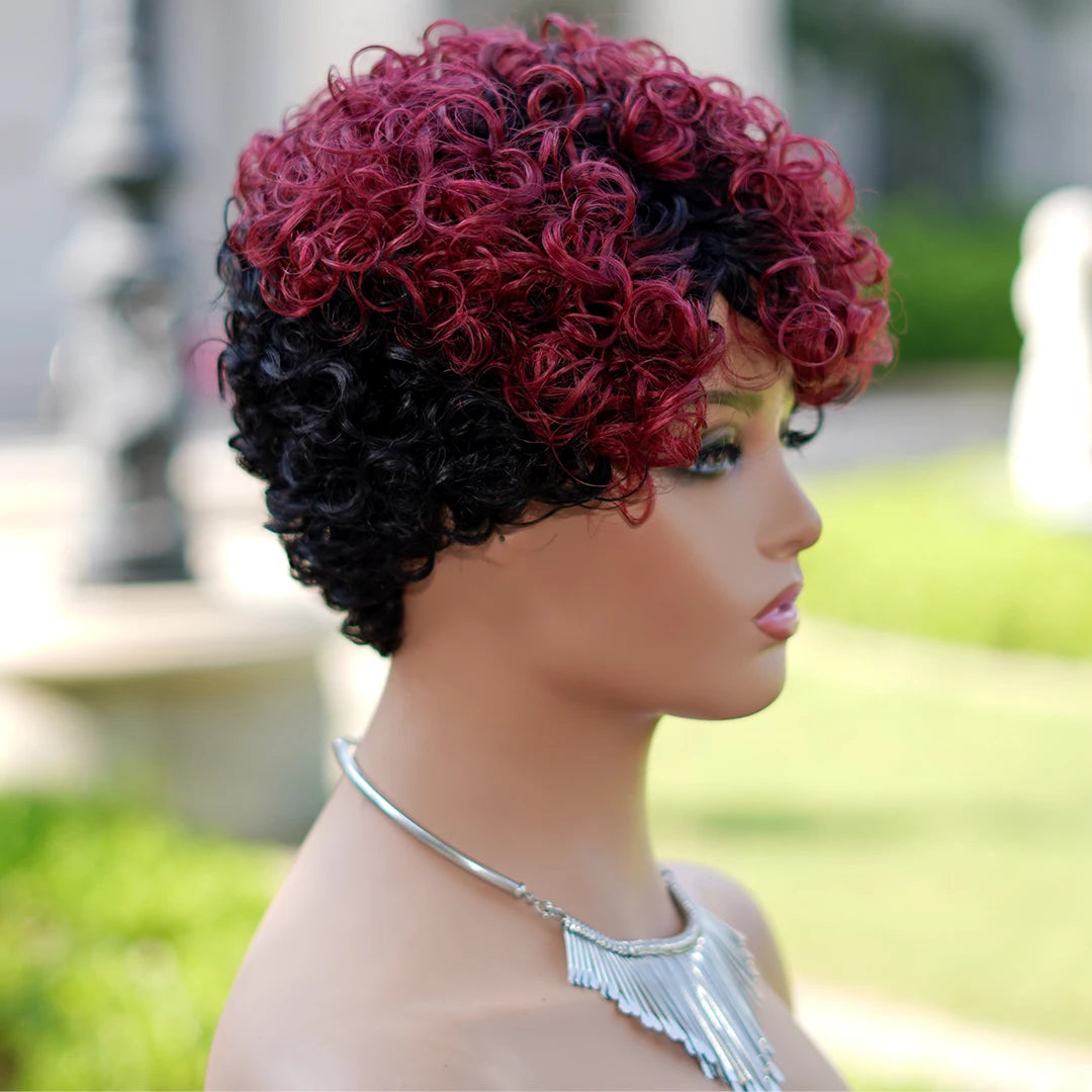 6inch Short Curly Wigs T1B/99J None Lace Front Human Hair Wigs with Bangs 180% Density Machine Made Pixie Cut Curly Wave Wig