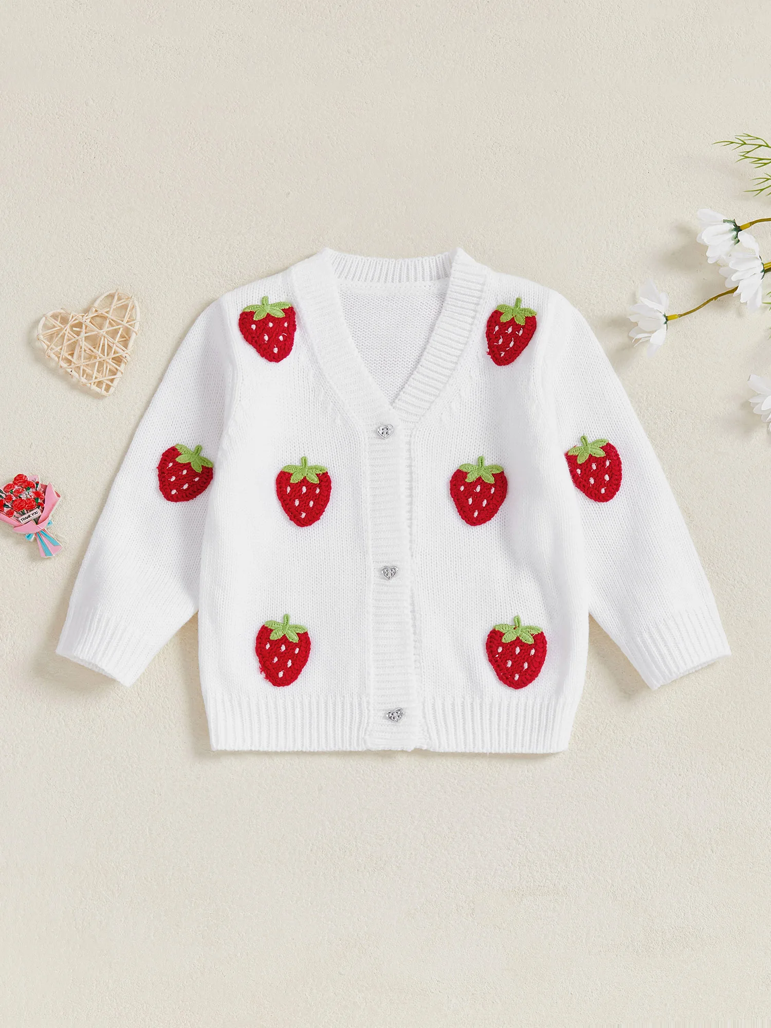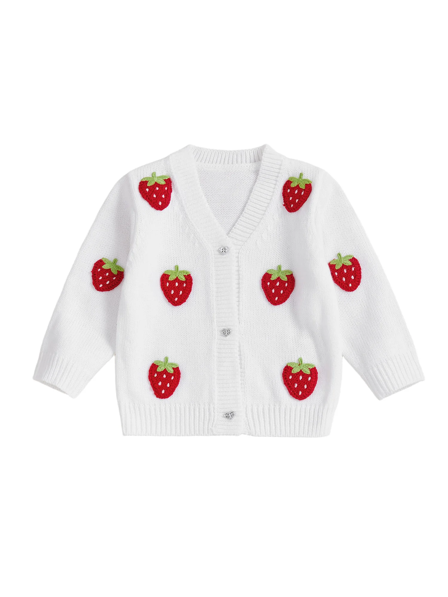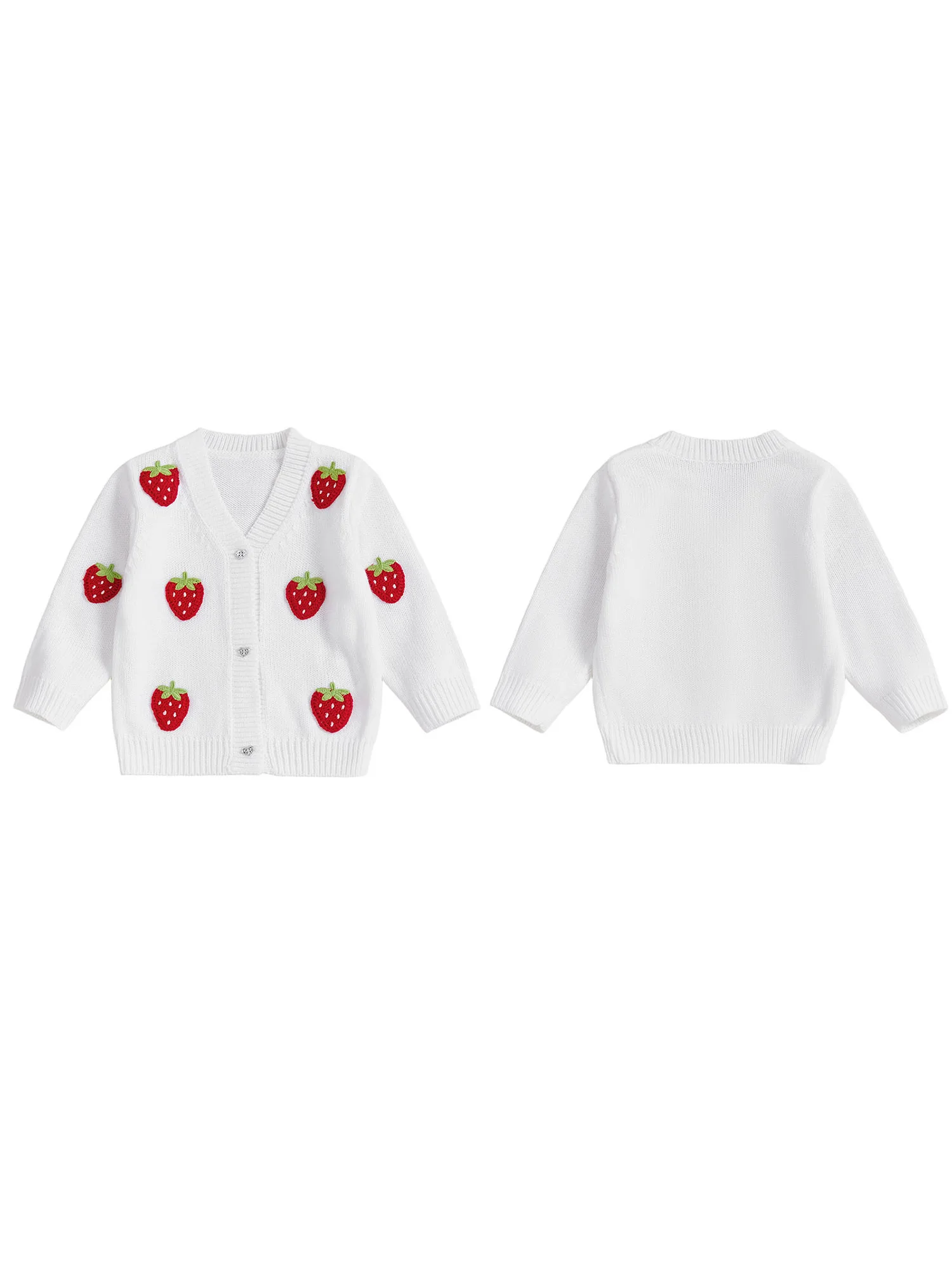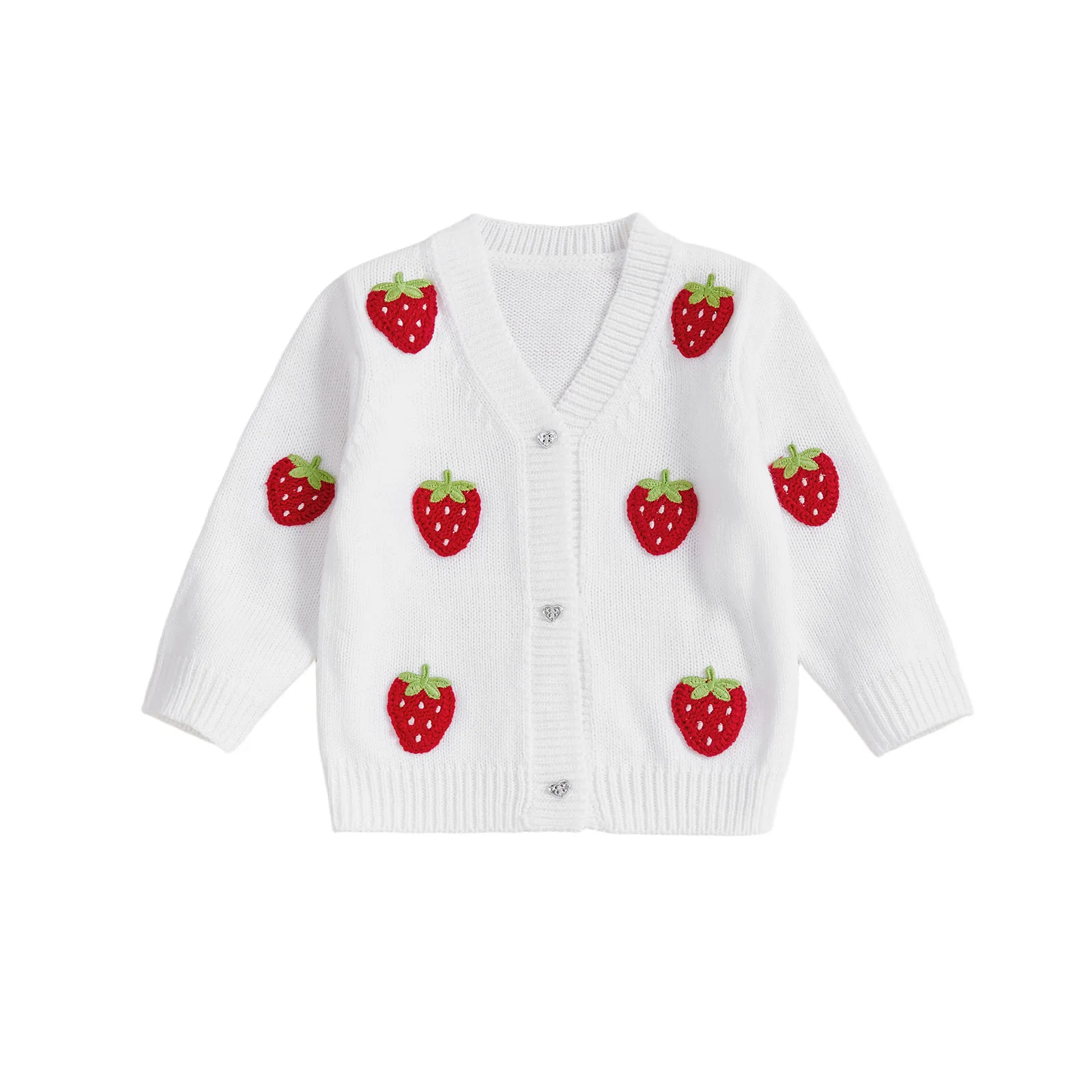 Crocheted strawberries, knitted fabric, long sleeves, front button closure, v-neck; Toddler girls sweater, simple and stylish, perfect for keeping your child warm and cozy in cold weather