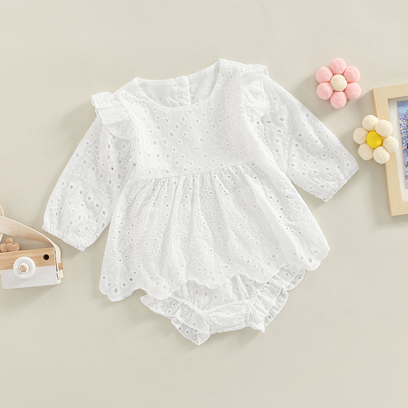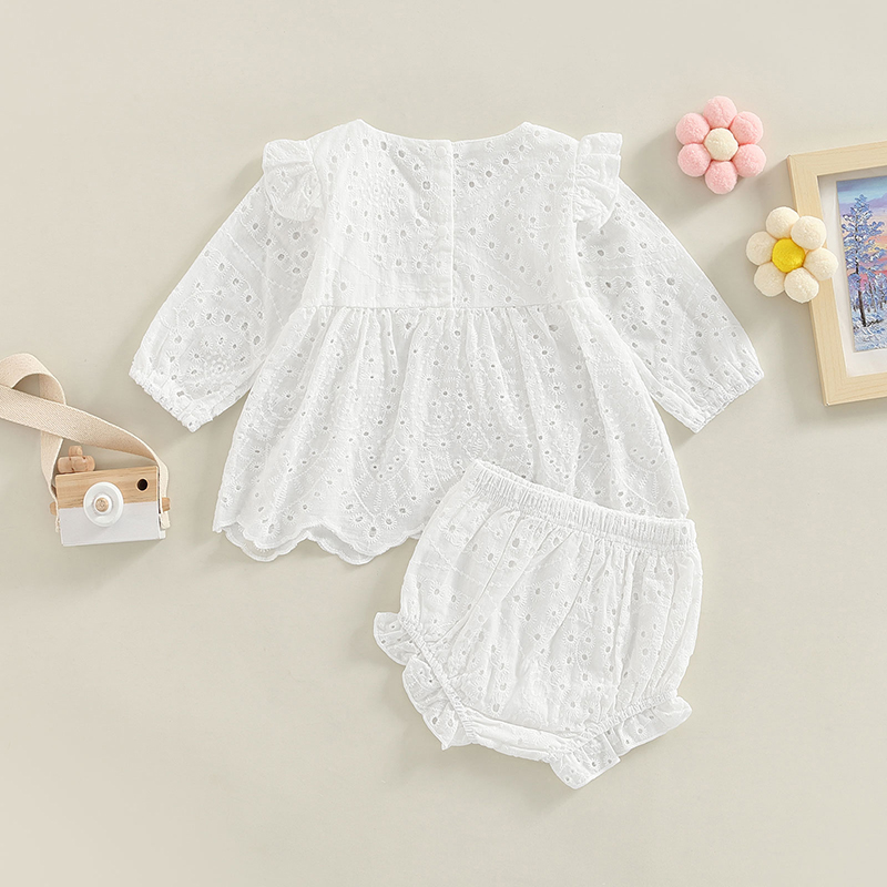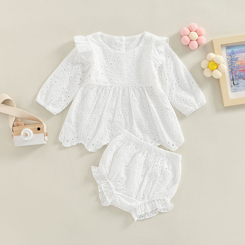 Adorable Infant Girls Outfit with Stylish Round Neck Long Sleeve Top and Cute Ruffle Shorts for a Casual Look