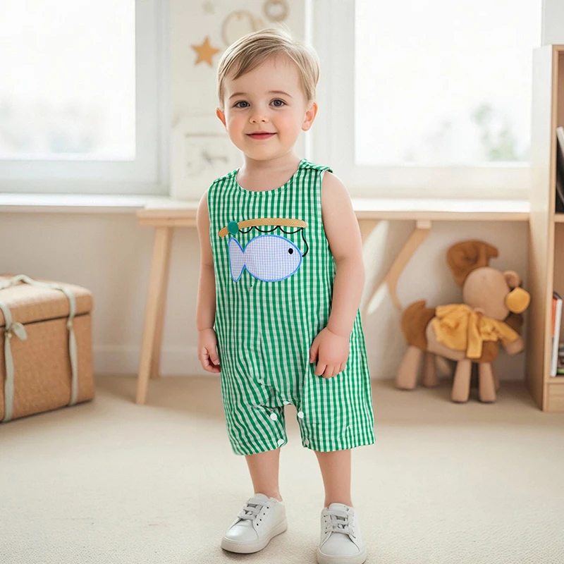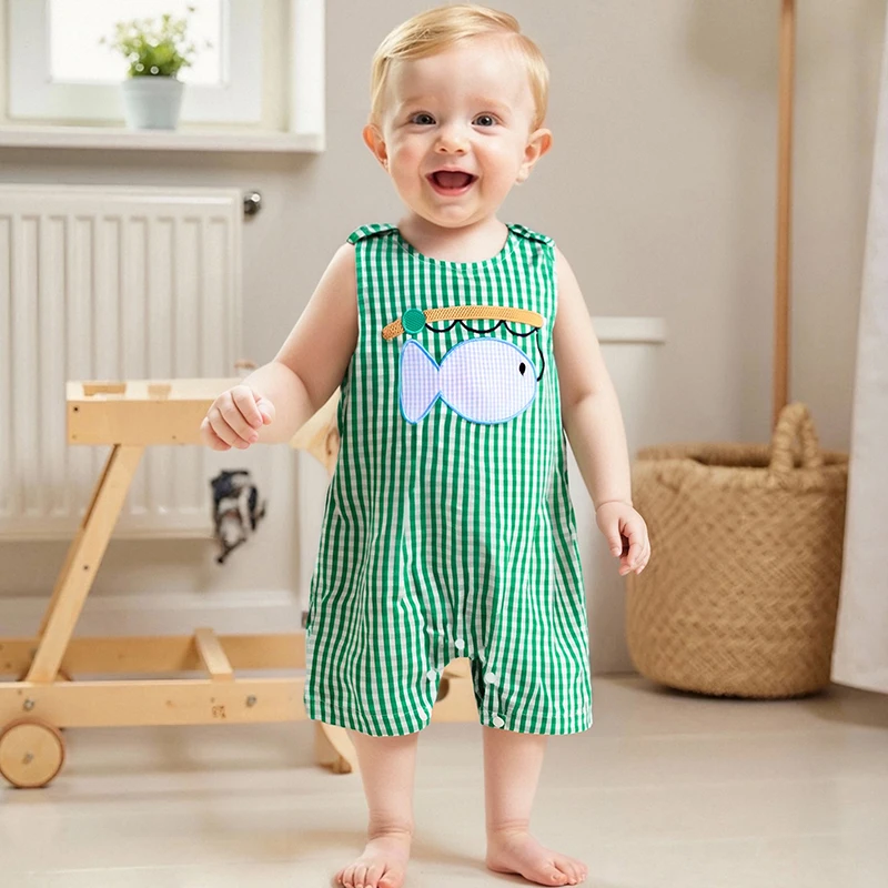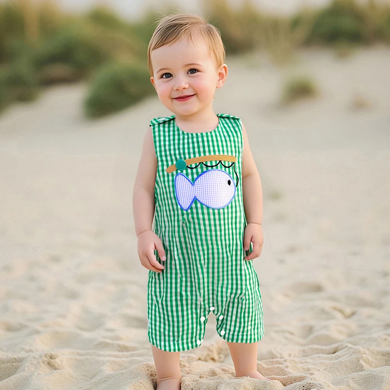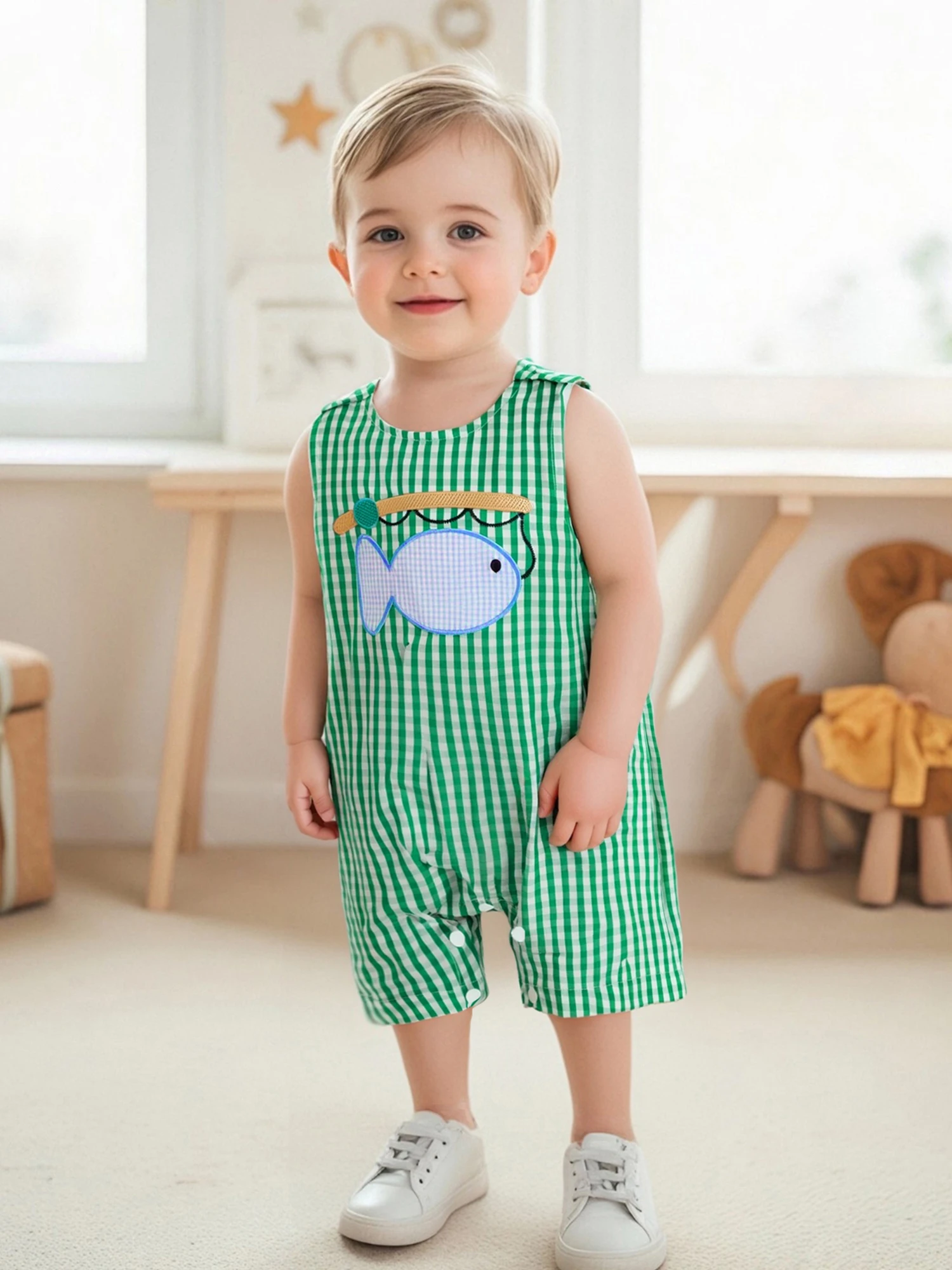 Baby Boy Romper Embroidered Fish Plaid Sleeveless Newborn Jumpsuit Infant Overalls for Summer