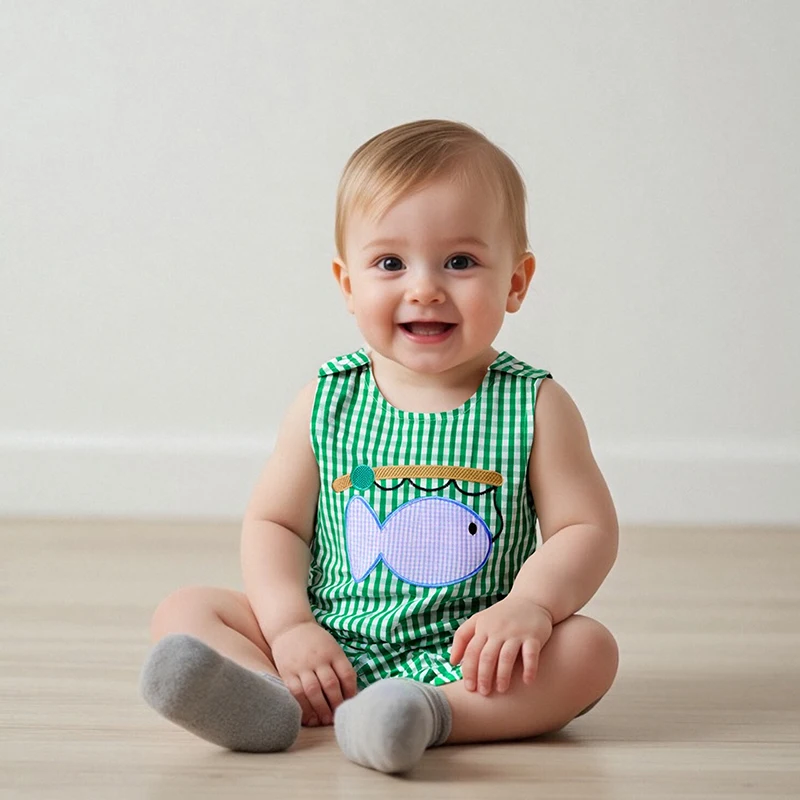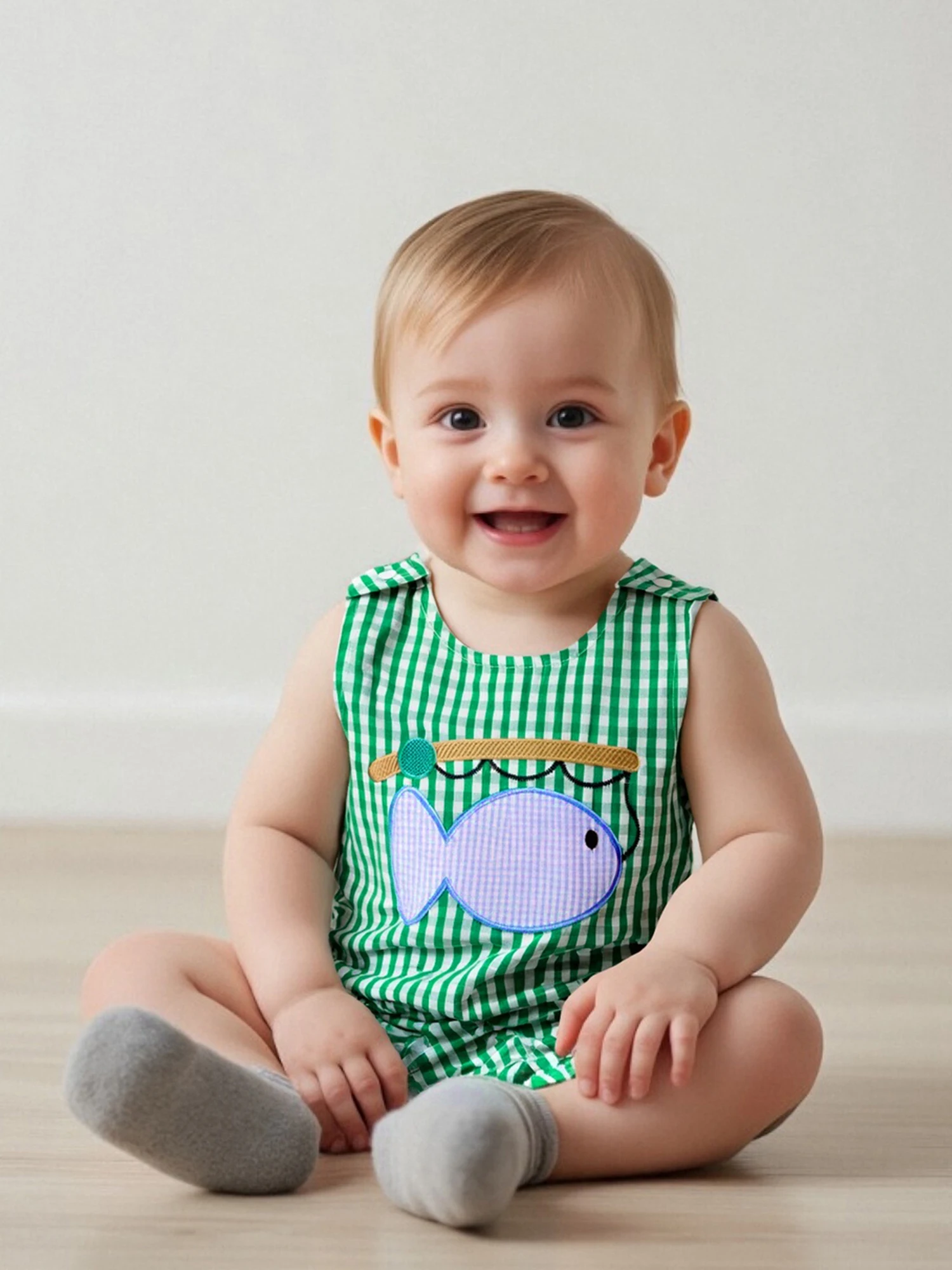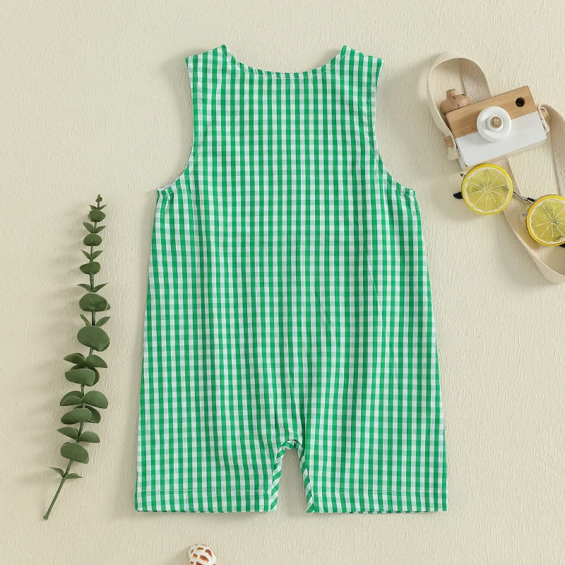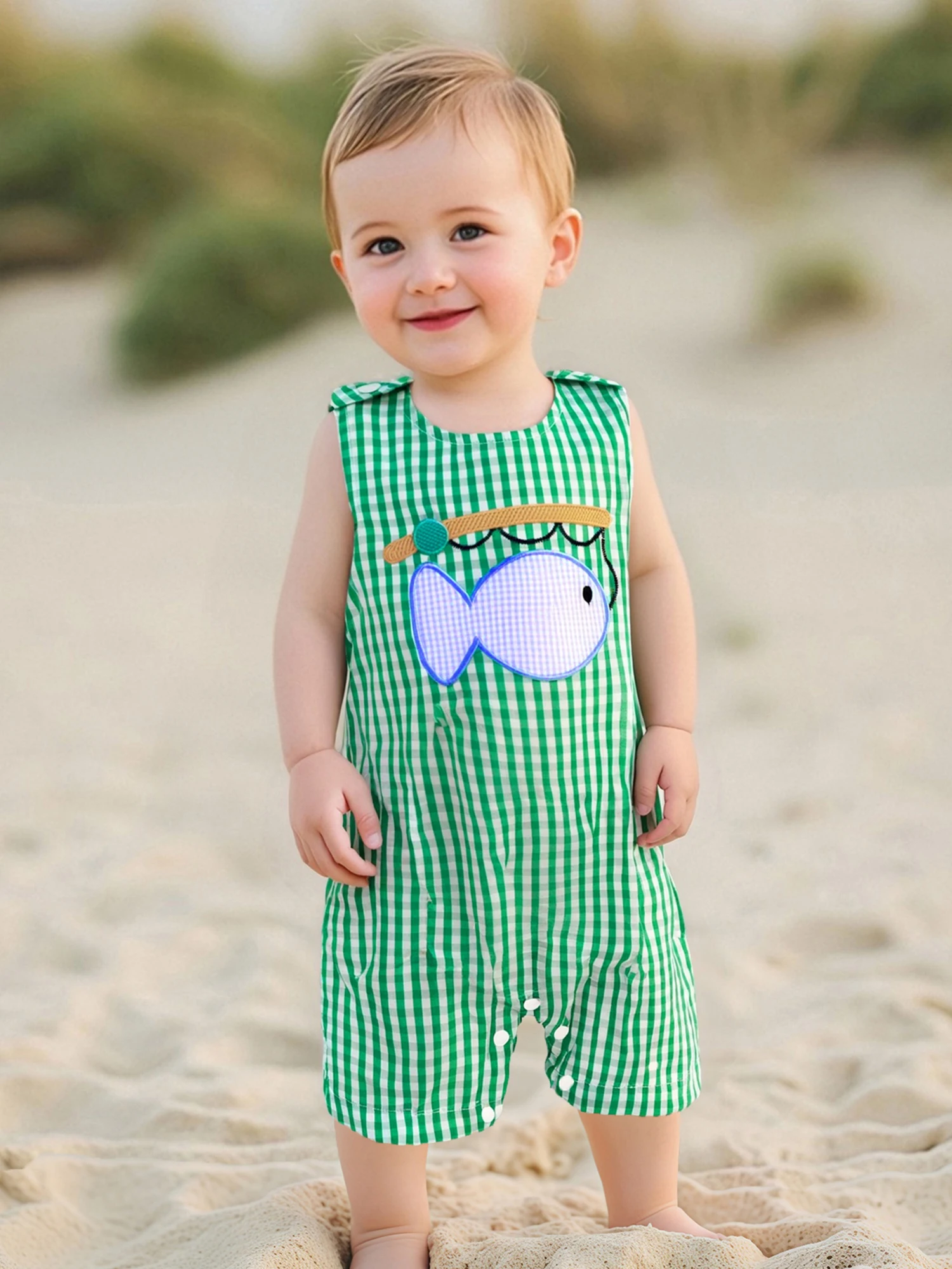 Baby Boy Romper Embroidered Fish Plaid Sleeveless Newborn Jumpsuit Infant Overalls for Summer