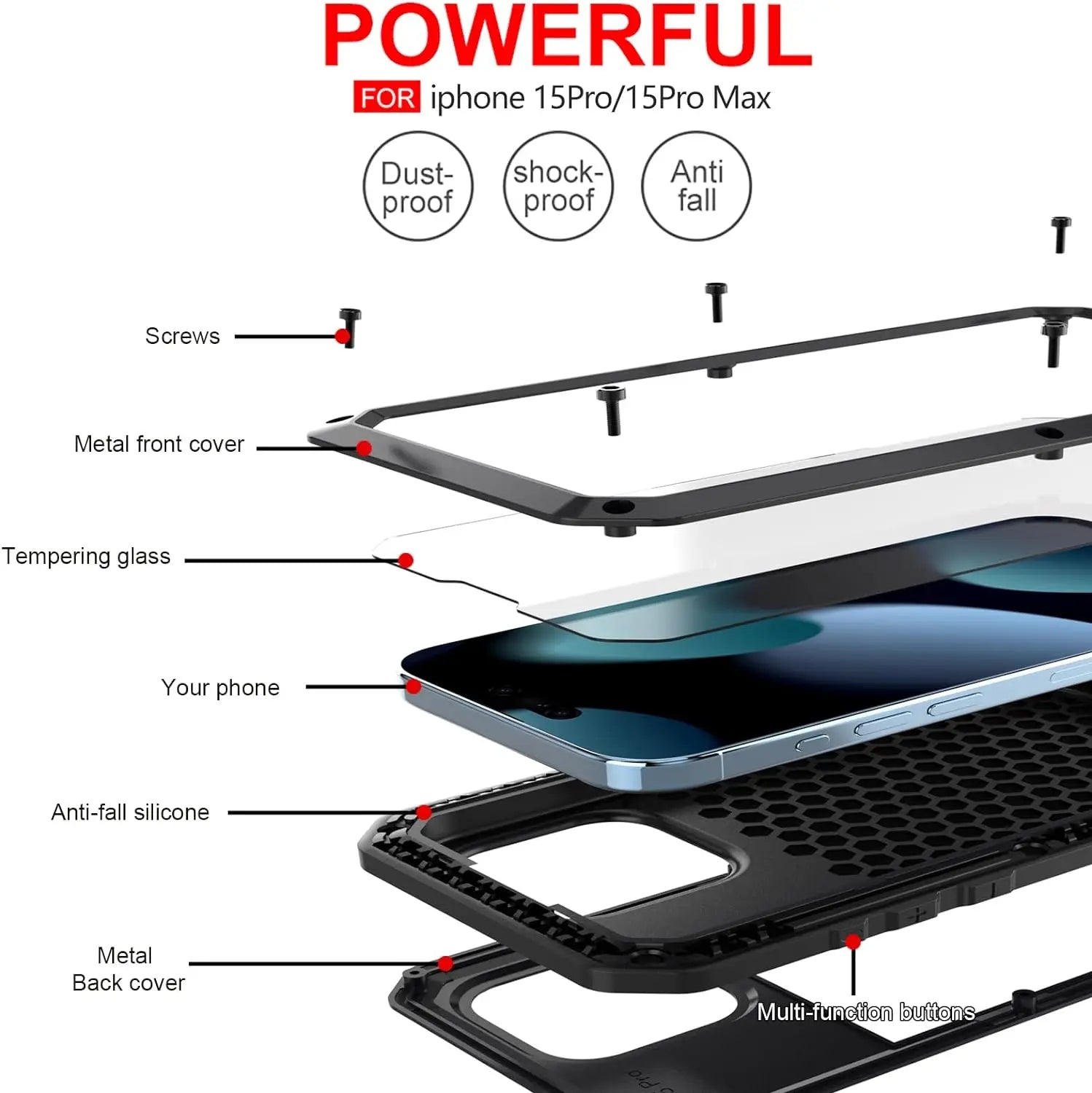 For iPhone 15 14 13 12 11 Pro Max XS XR 8 7 Plus Aluminum Metal Tank Case Heavy Duty Shockproof Rugged Armor Cover Screen Film