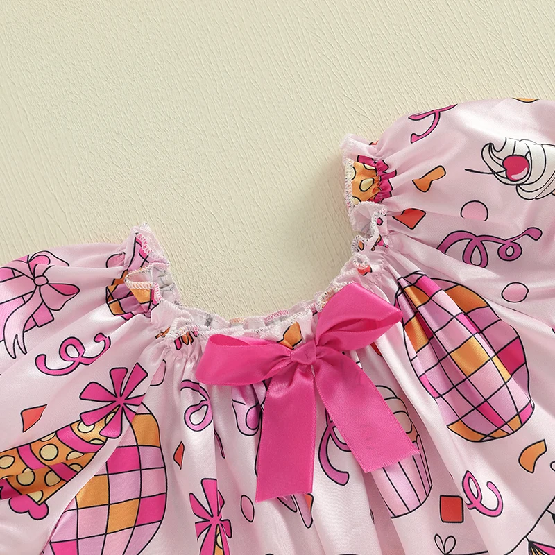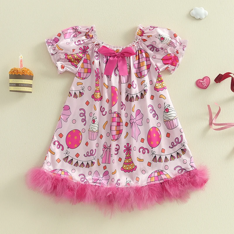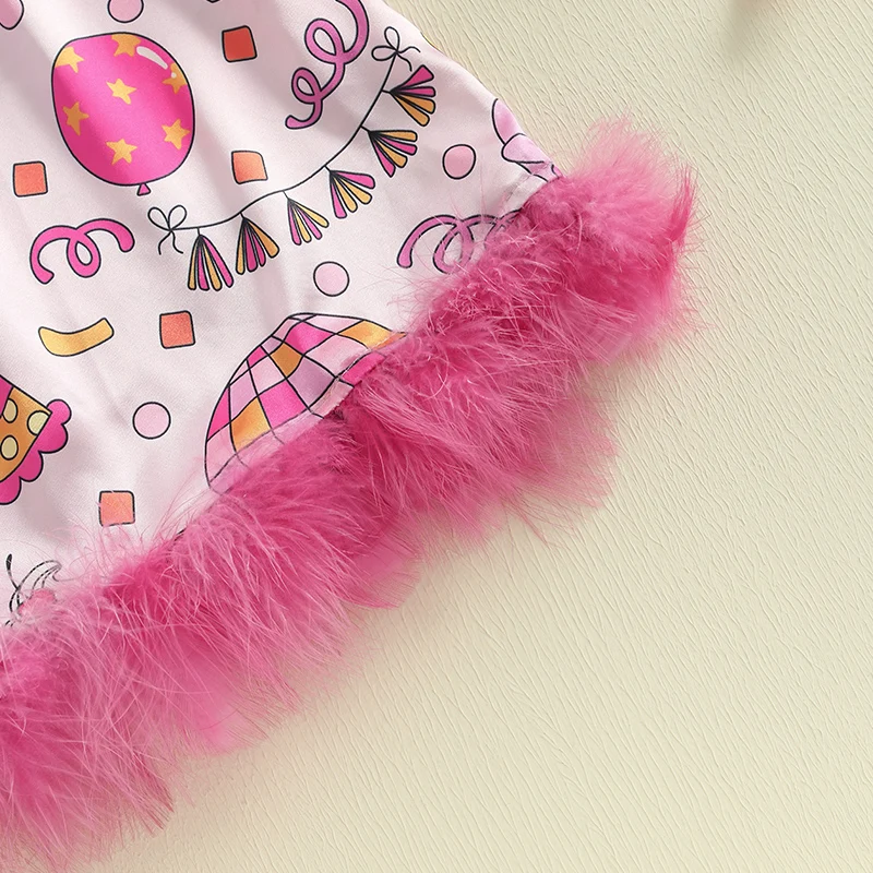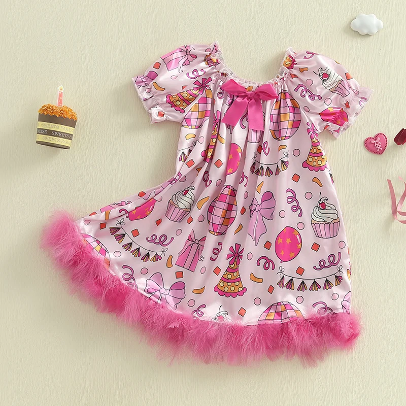 Kids Girls Nightgowns Birthday Toddler Nightgown Balloon Cake Print Plush Trim Sleepwear Night Sleep Dress Princess Pajamas