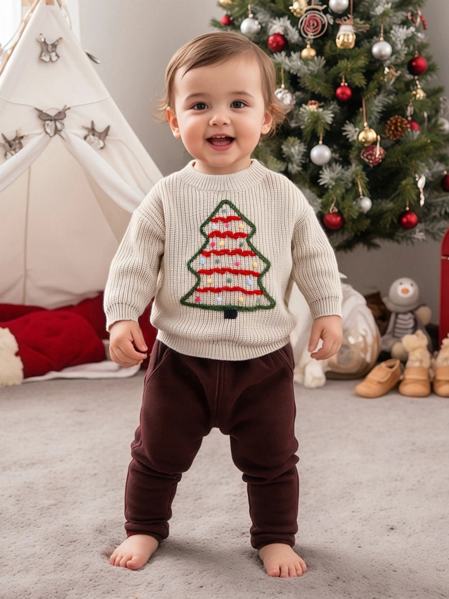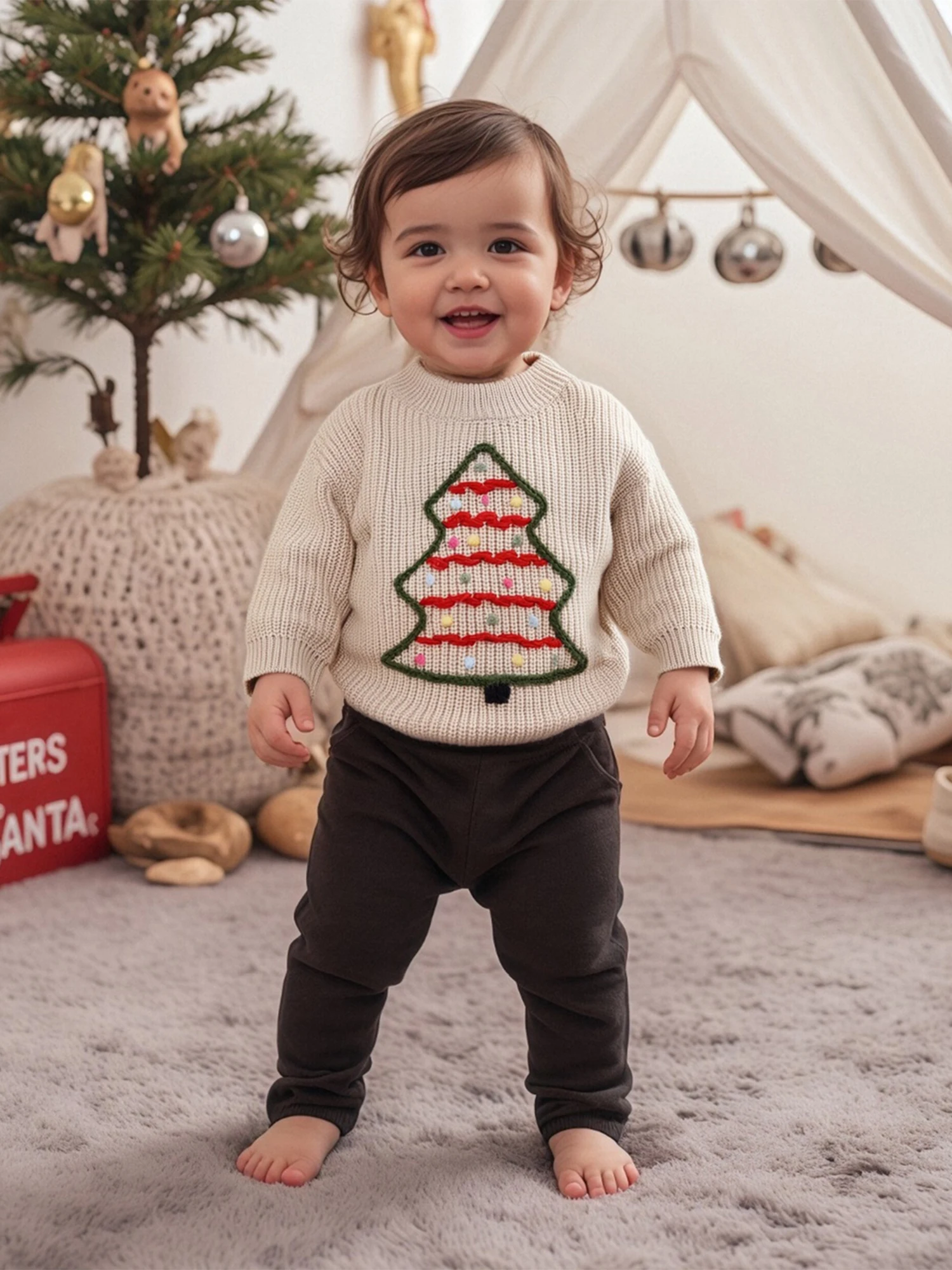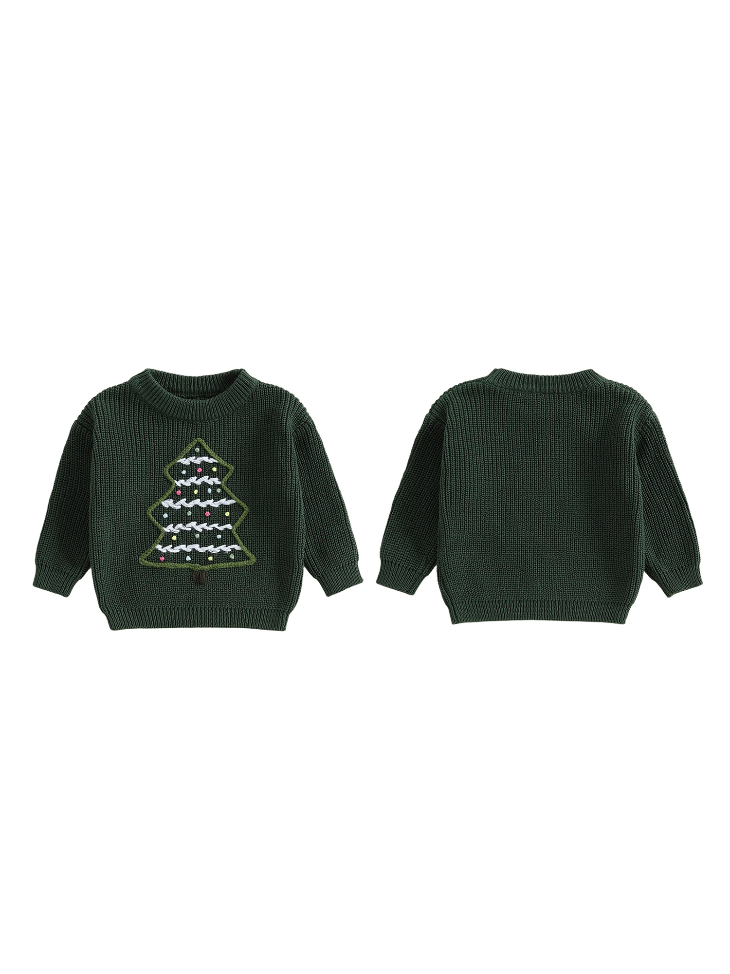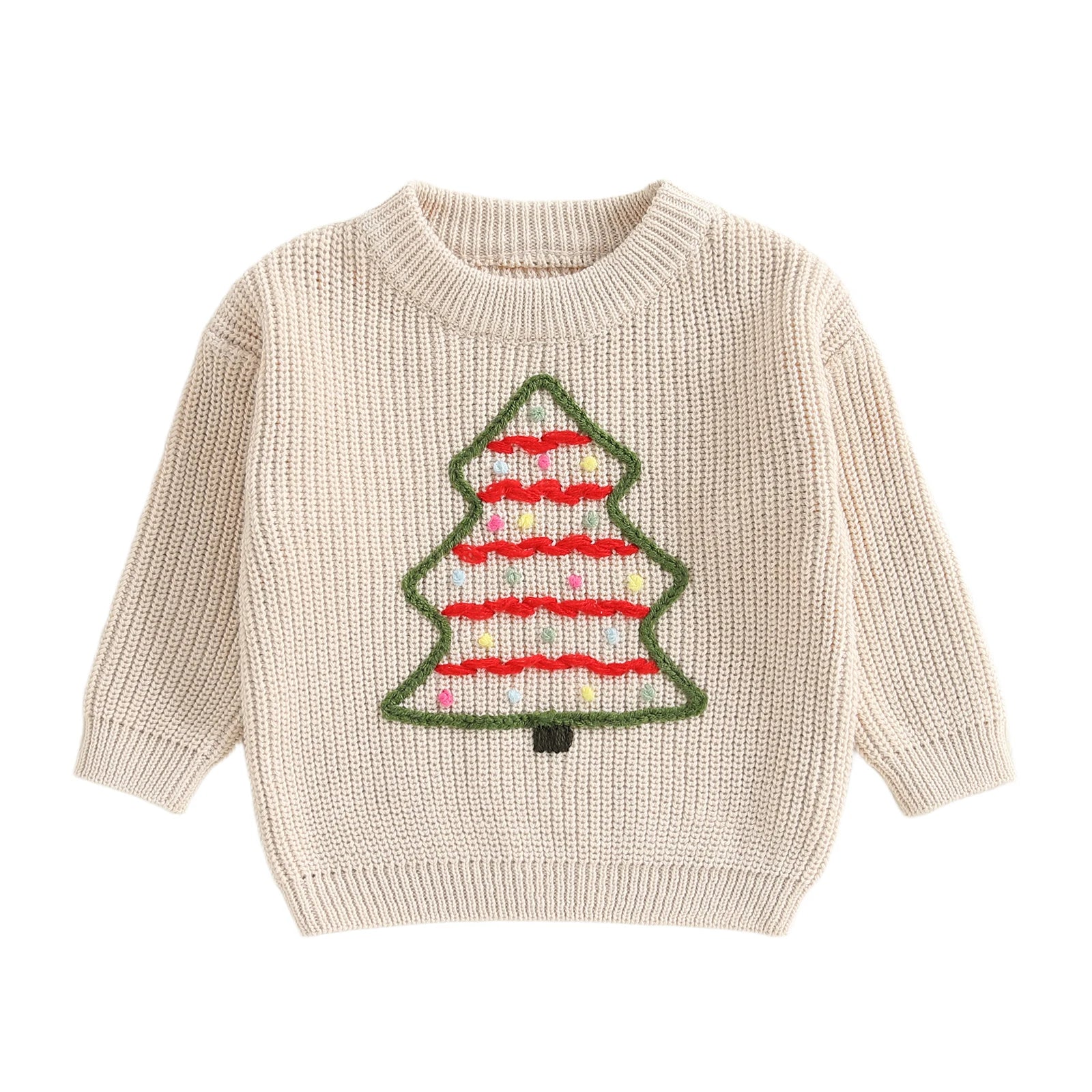 Toddler Baby Christmas Sweater Christmas Tree Embroidered Ribbed Long Sleeve Knitted Tops for Fall/Winter