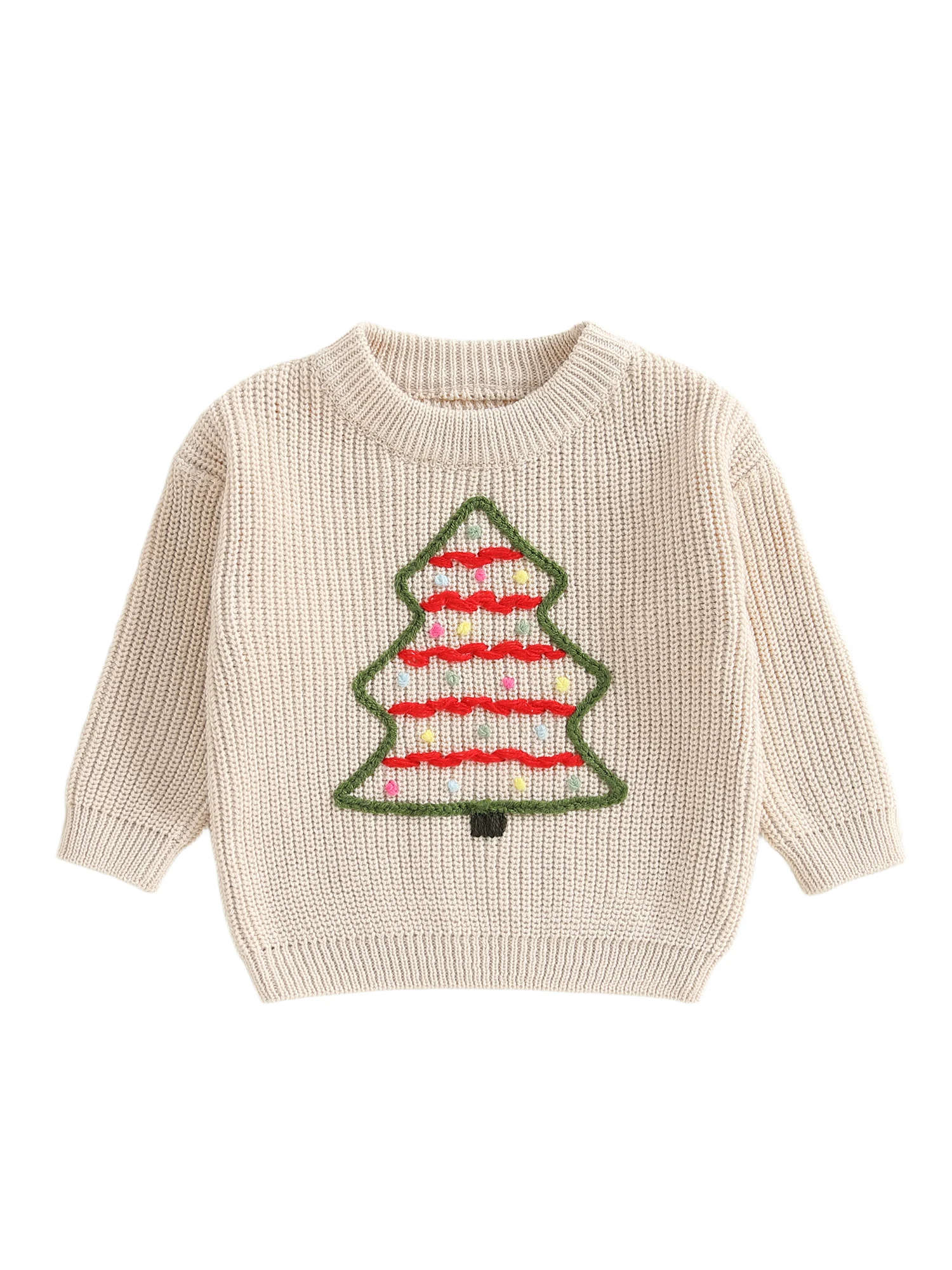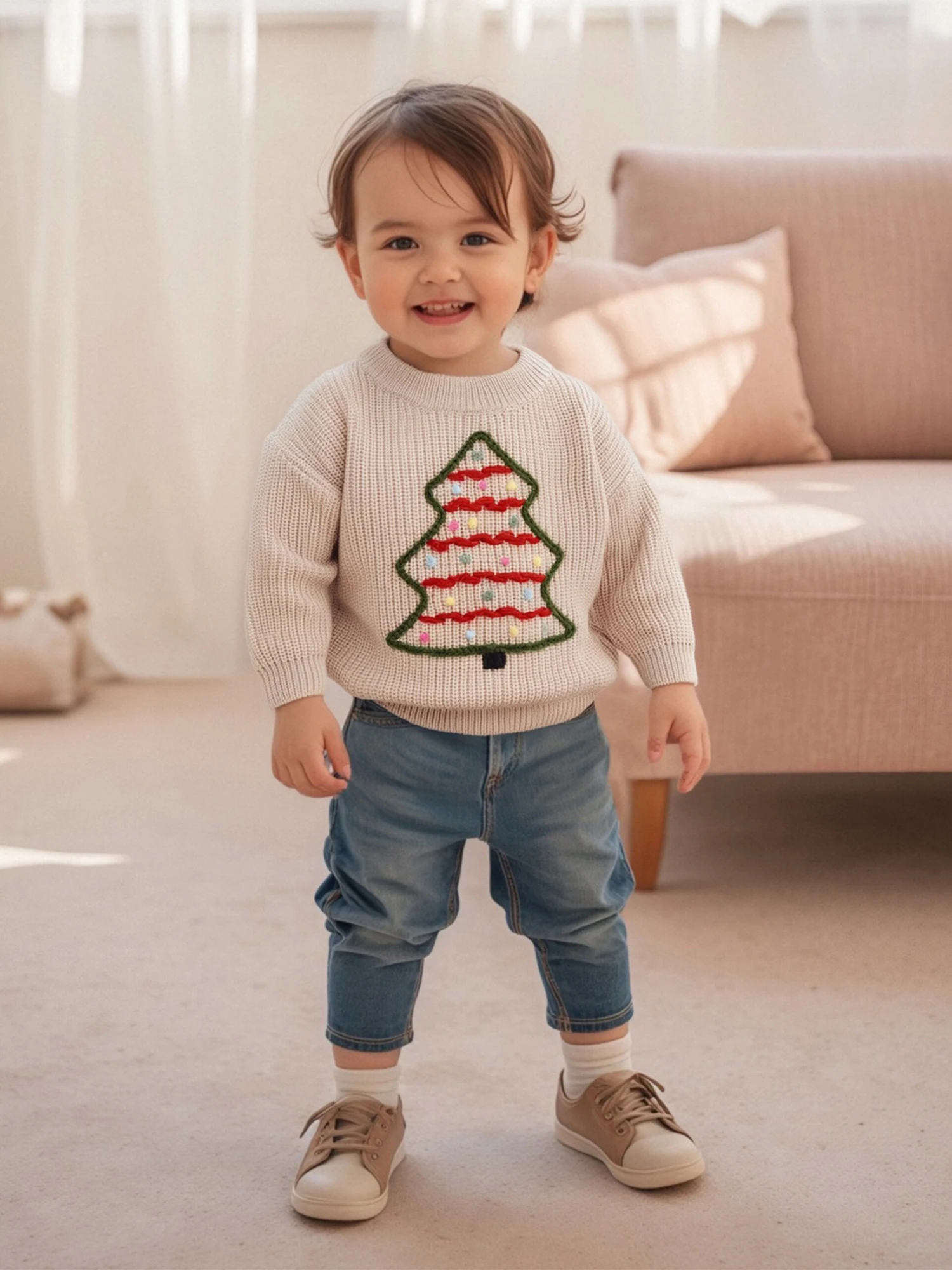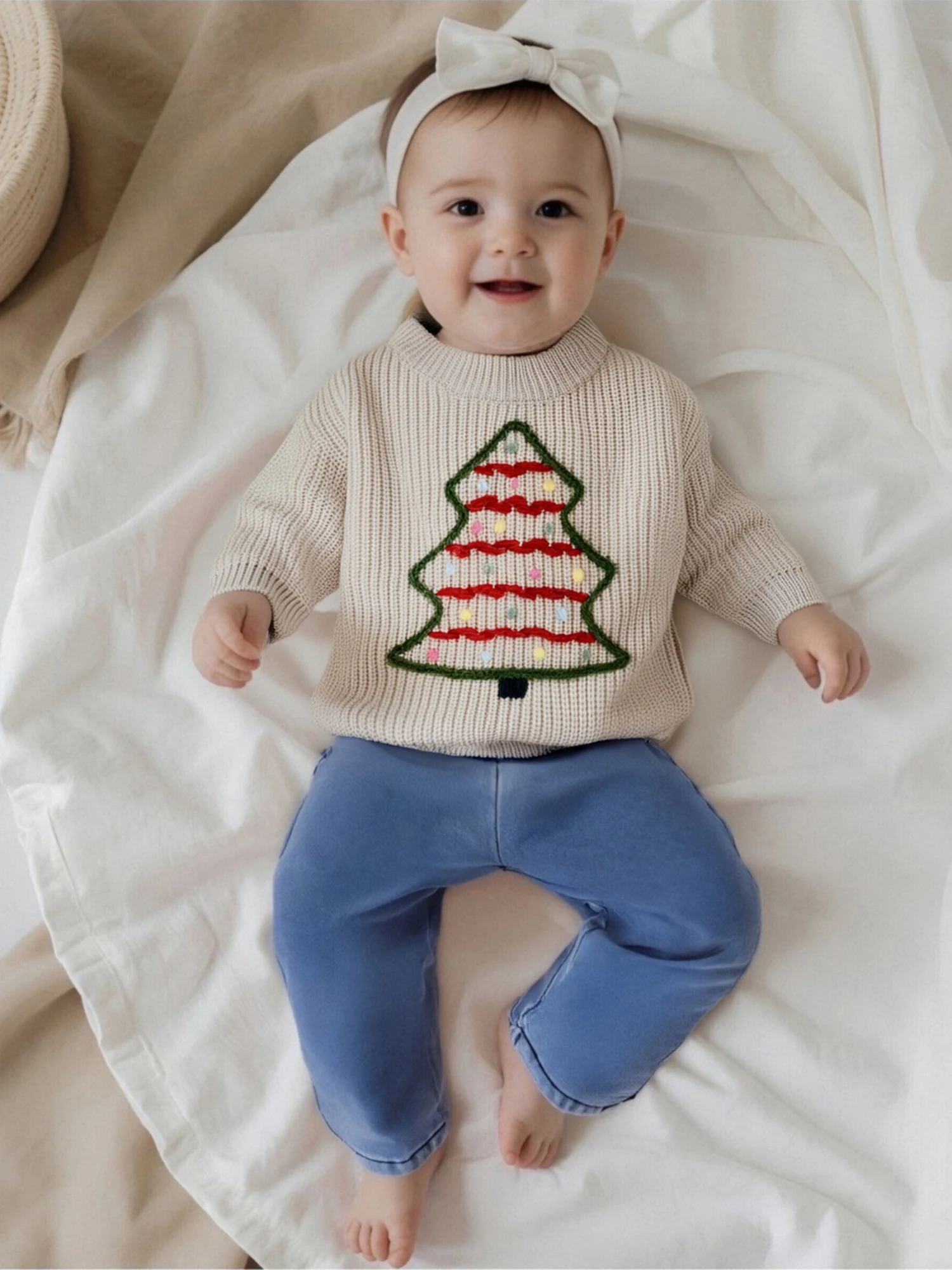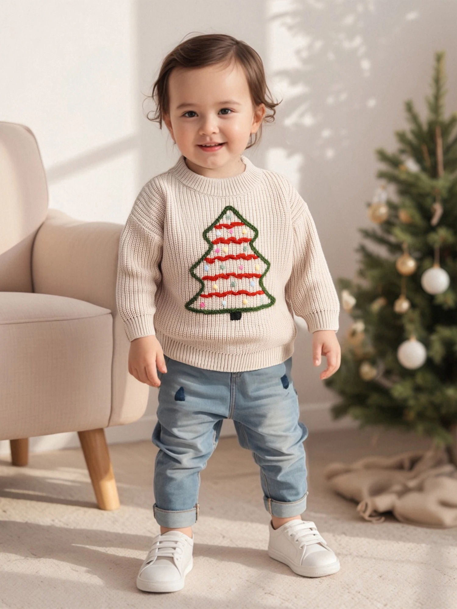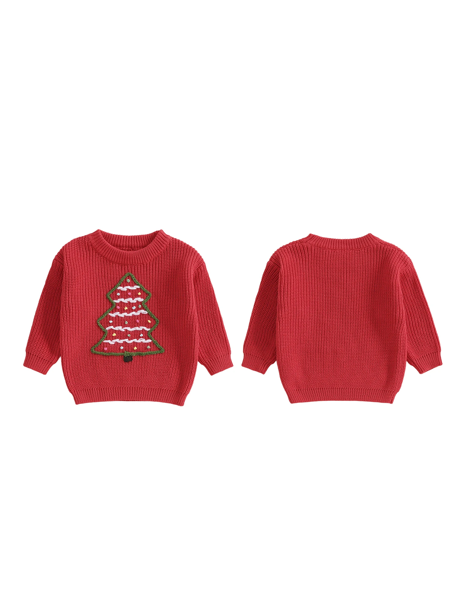 Toddler Baby Christmas Sweater Christmas Tree Embroidered Ribbed Long Sleeve Knitted Tops for Fall/Winter