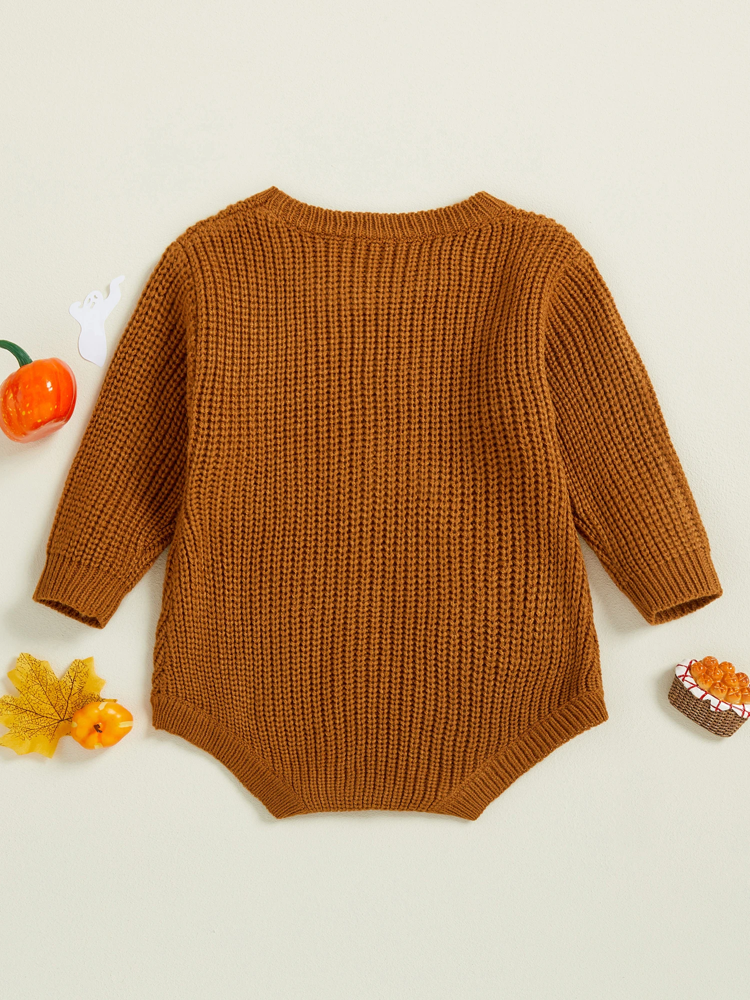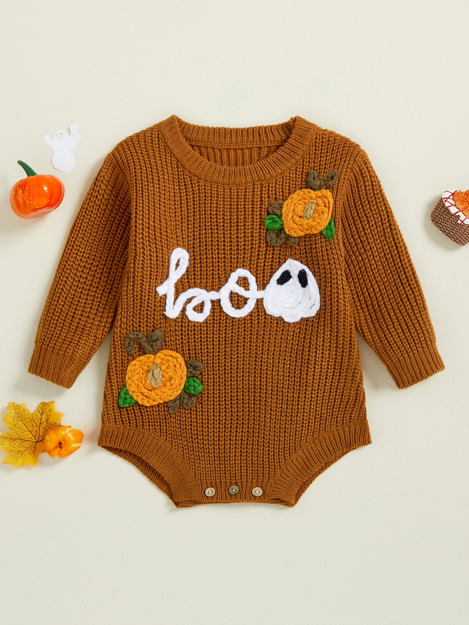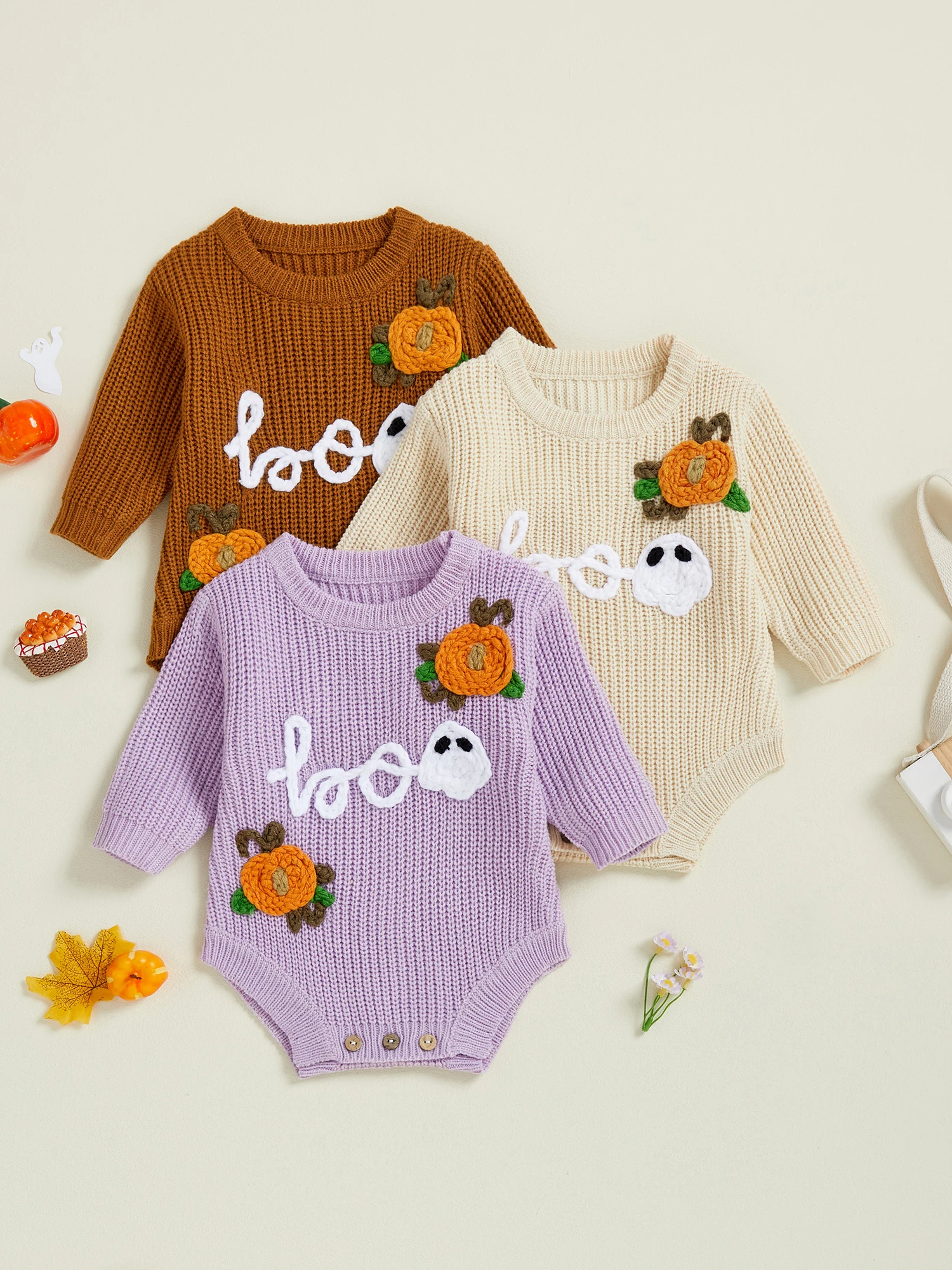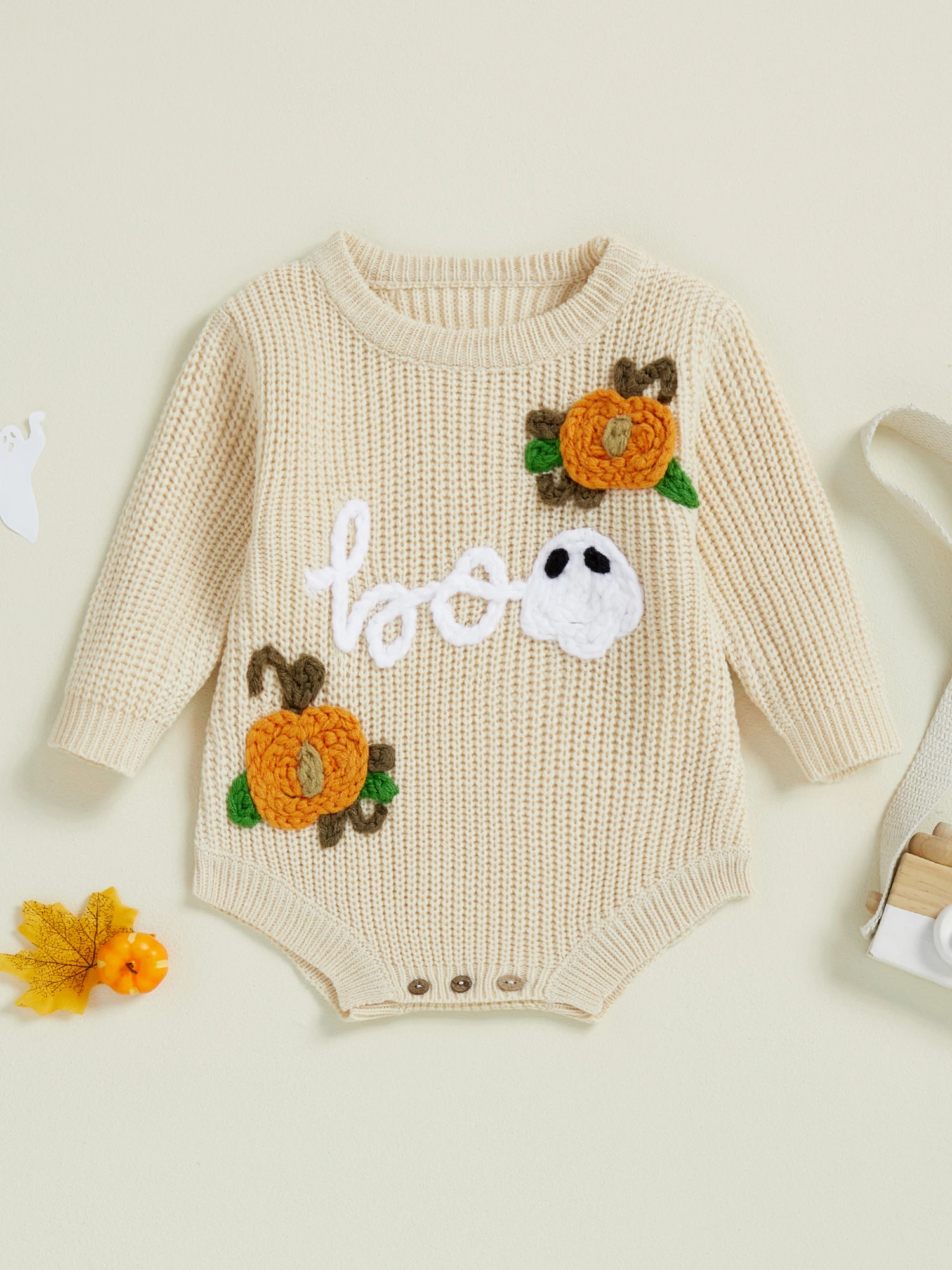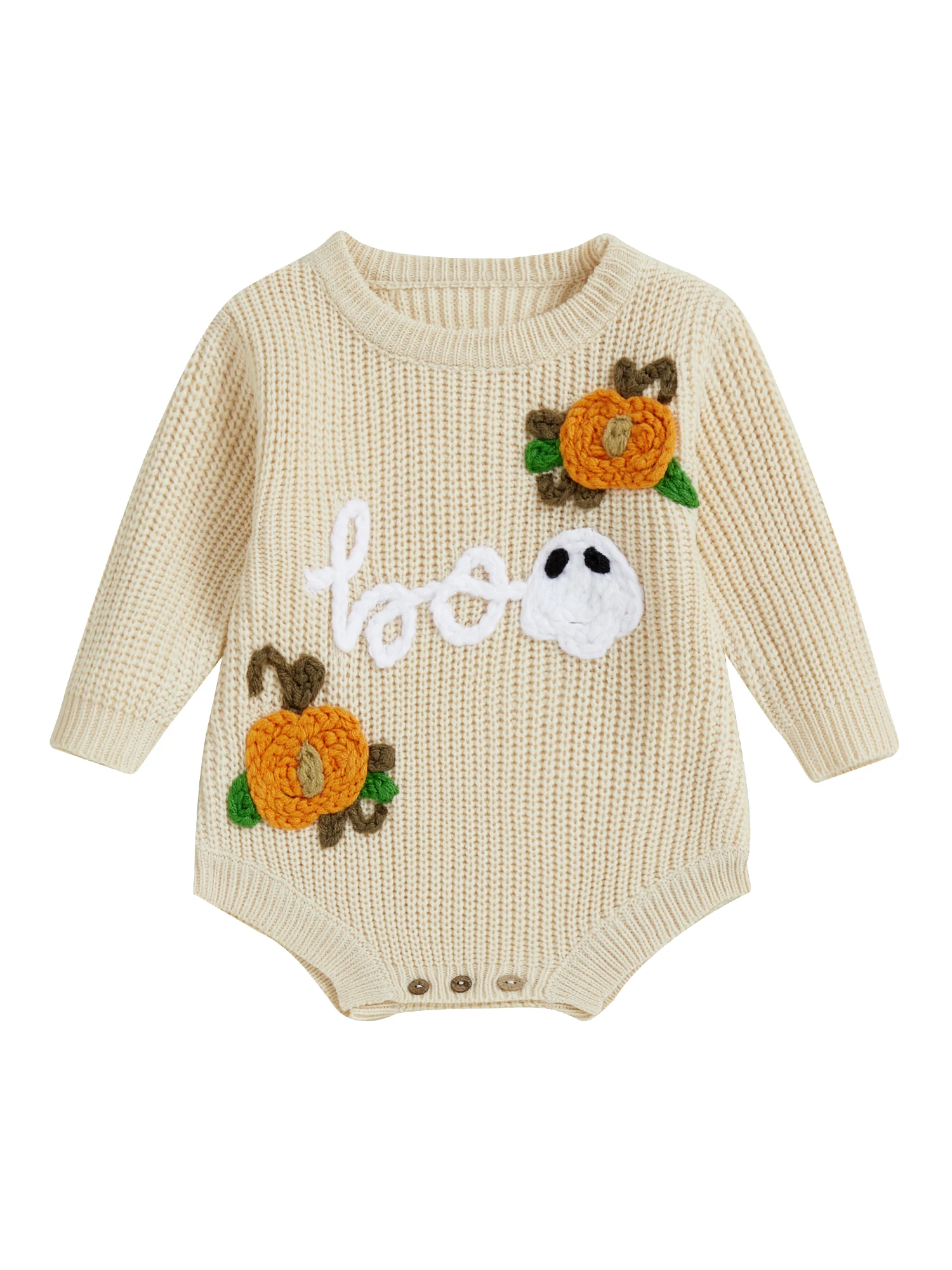 Baby Boys Girls Halloween Romper Long Sleeve Pumpkin Ghost Embroidery Knit Bodysuit Newborn Fall Playsuit