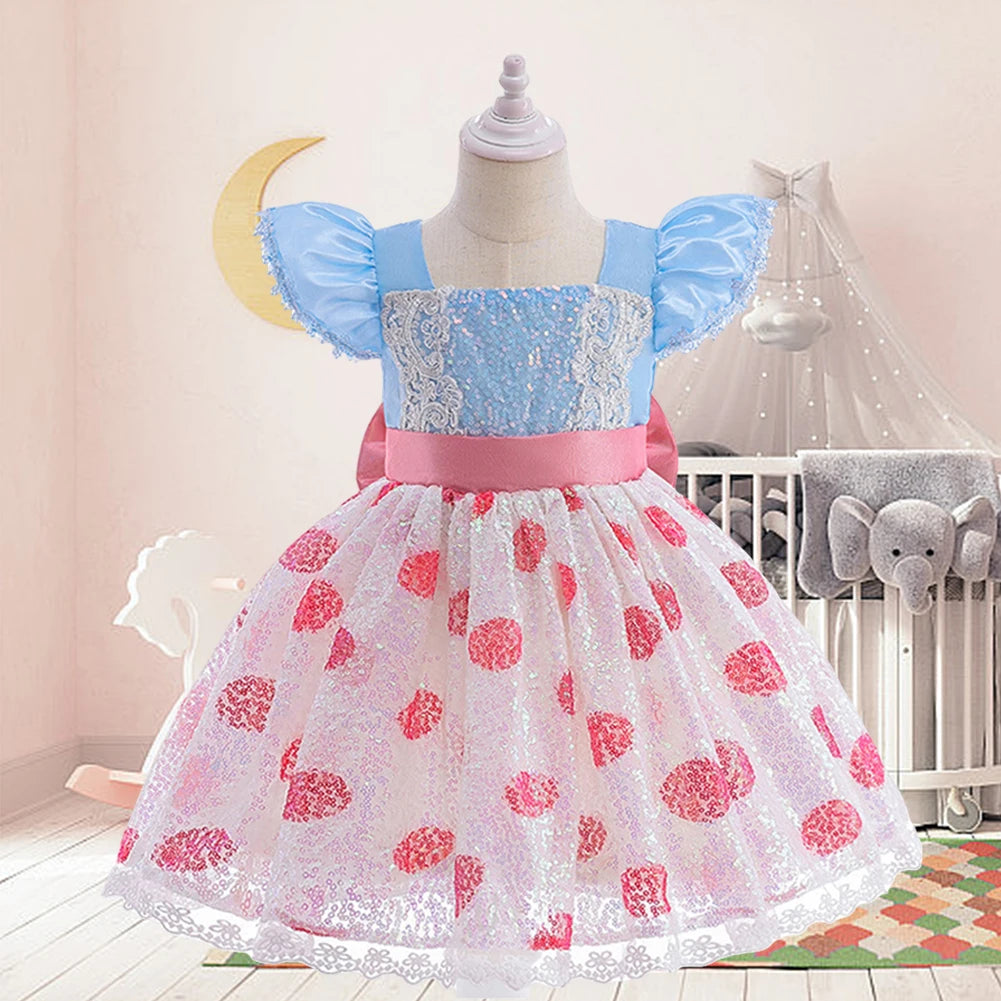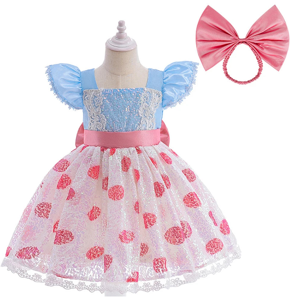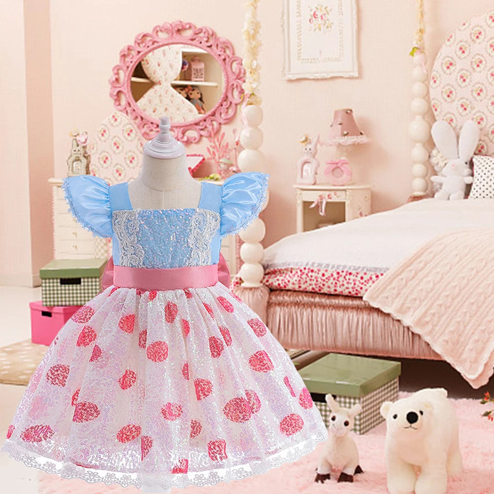 Flying Sleeve Sequins Dress with Hair Band Little Shepherdess Princess Dress Dot Sequin Lace Dress for Halloween Carnival Party Features: 1.Fairy Tale Inspired: With inspiration drawn from a classic animated shepherdess, this girls princess dress combines modern fashion with meticulous craftsmanship. Every inch, from the cascading skirt to the intricate details, is designed to transform any child into the protagonist of their very own fairy tale. 2.Breathable Fabric: Made with airy polyester material, this kids cosplay costume is gentle on the skin and remains comfortable for hours on end, offering little princesses the joy of cosplay along with the soft, cloud-like comfort they deserve. 3.Safety First Detailing: Rigorously tested for quality, every flying sleeve sequins dress is free of sharp edges and harmful substances. Adornments like sequins and lace are securely attached, ensuring the safety and protection of delicate skin. 4.Versatile Sizing: Available in multiple sizes to accommodate growing girls of various ages, this pink polka dot skirt ensuring that every young model can find their perfect fit for the most comfortable dressing experience. 5.Memorable for Any Occasion: Ideal for stage performances, Children's Day, birthday parties, photo shoots, or role-playing games, this fancy princess dress for girls will make them the center of attention and create cherished childhood memories.