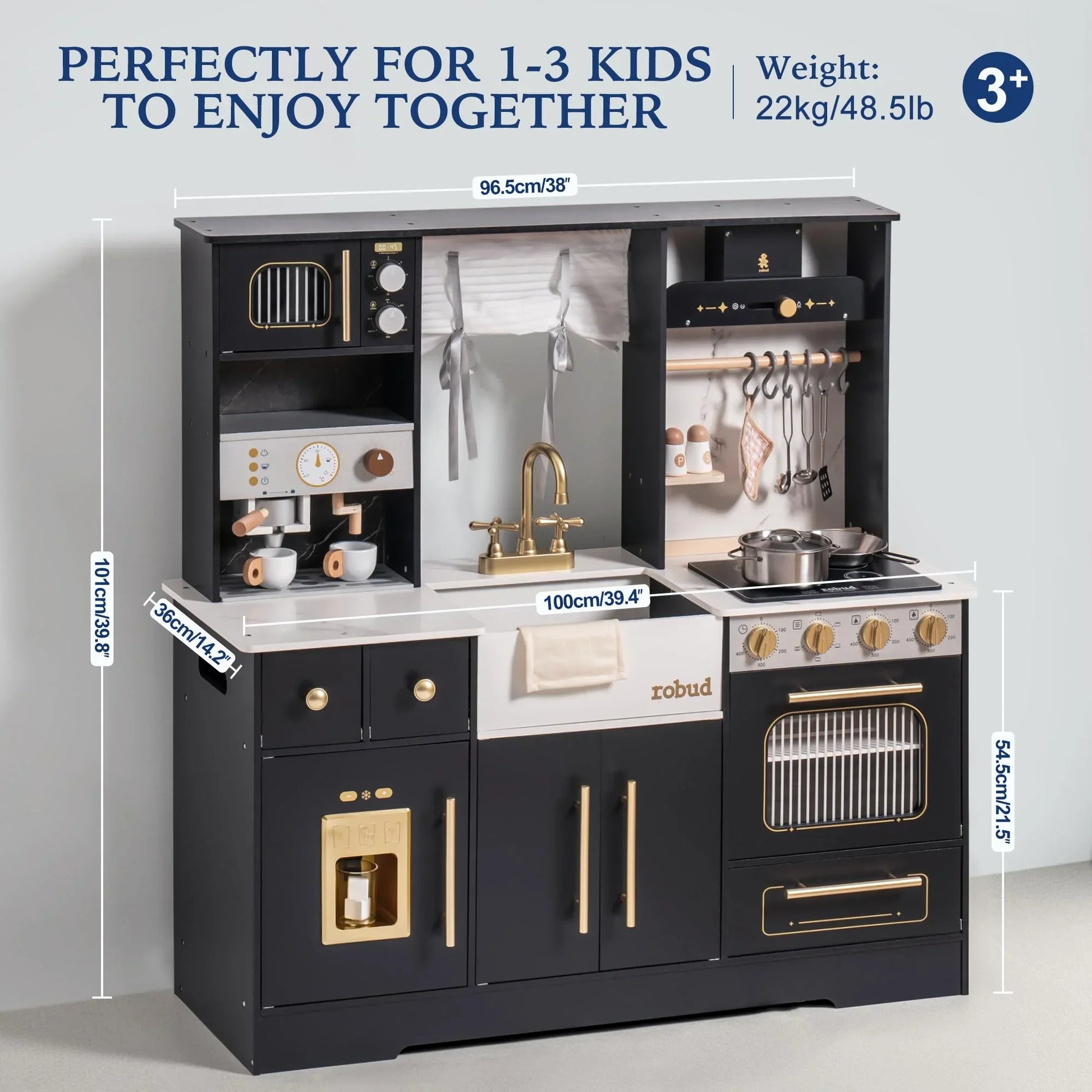 Robotime Robud Play Kitchen Wooden with Wash basin Cookware Accessories Microwave Toy Kitchen Gift for Boys Girls 3+ Black White