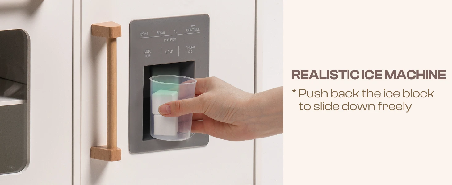 🏡Functional-Play-Kitchen👨🍳: Elevate playtime with our Wooden Play Kitchen! ✨ Chic white design, wooden handles, and a shiny metal faucet transport your child to a world of creativity. 🎨 The stove, with sounds, brings cooking joy to life. Plus, an integrated ice maker ❄️ adds a cool touch for endless imaginative play!
