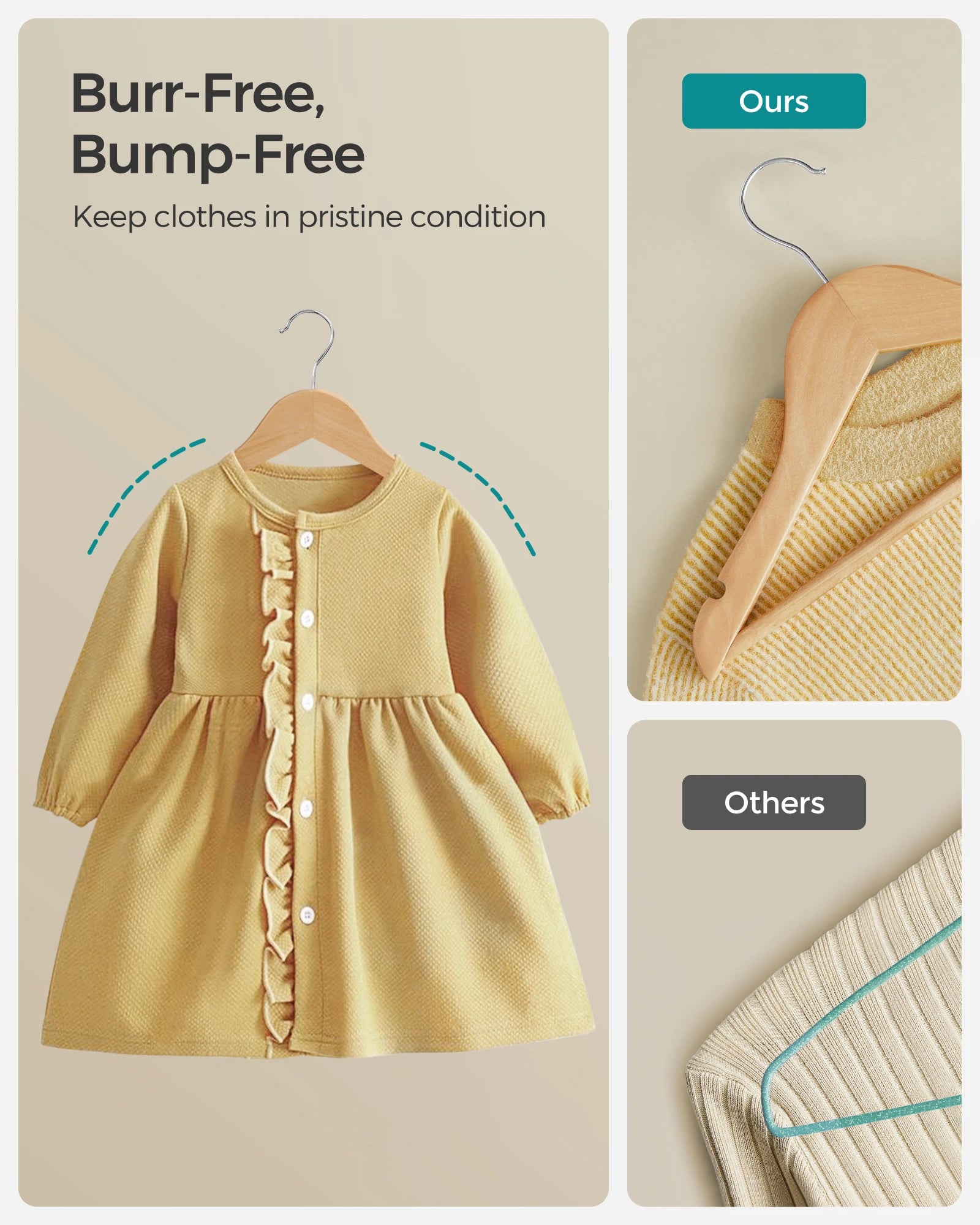SONGMICS Kids Wooden Hangers 20 Pack, Solid Wood Baby Hangers, Children's Coat Hangers with Pants Bar, Shoulder Notches