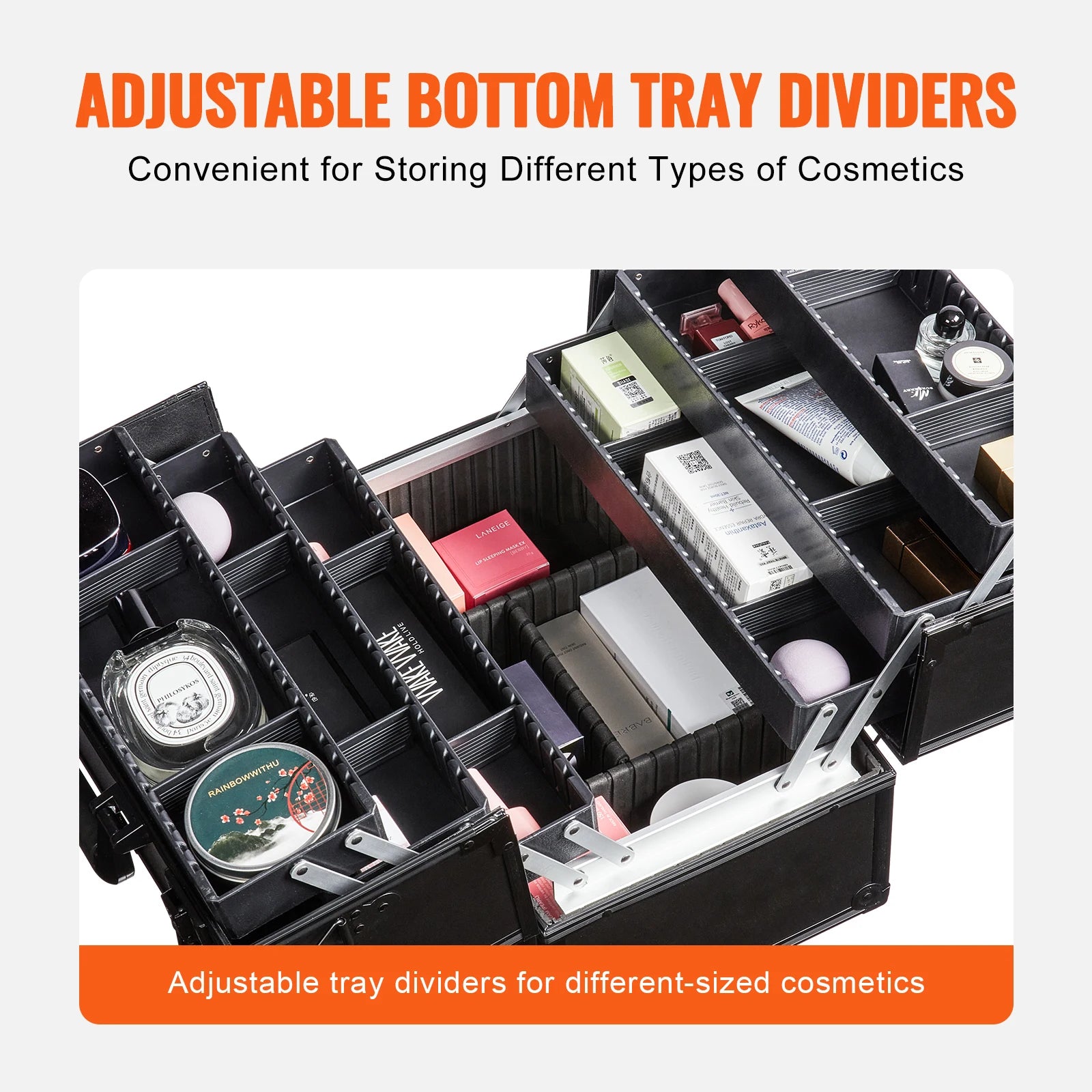 Thoughtful Interior Design: The makeup case's bottom storage divider can be freely adjusted in length, allowing you to store lipsticks, nail polishes, and small items, or larger items such as palettes, hairdryers, and straighteners, catering to different usage needs.