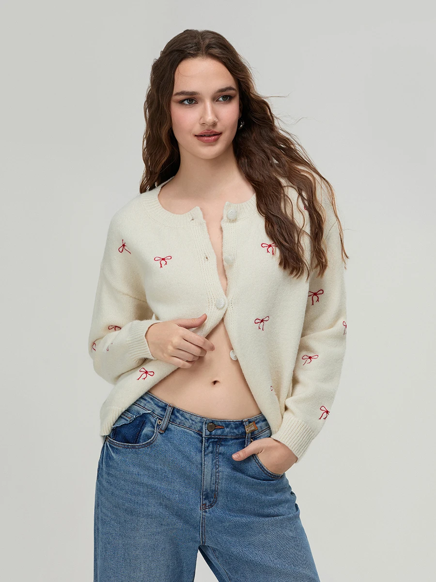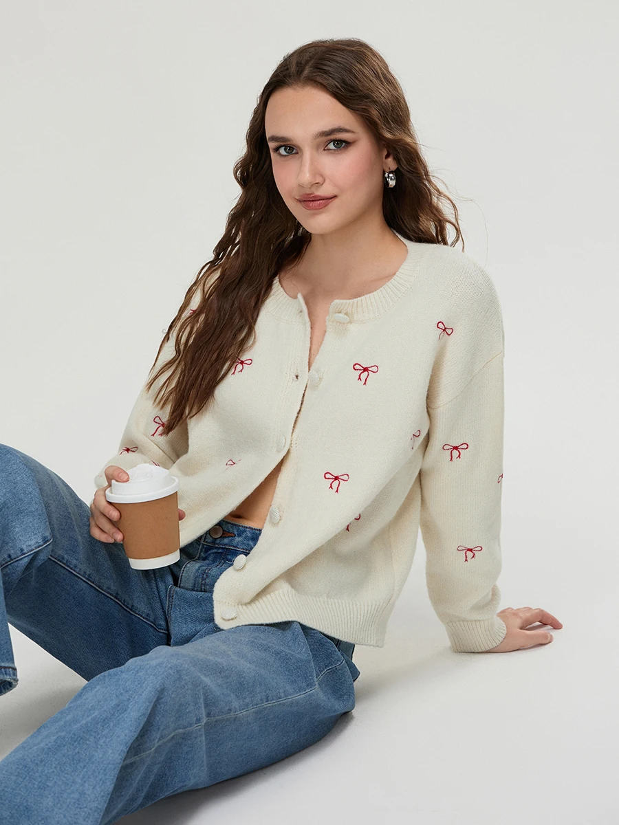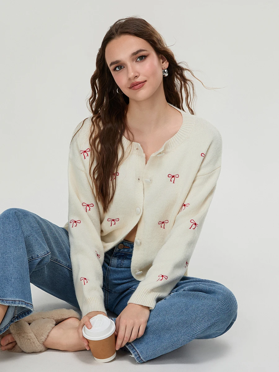 Womens Bow Embroidery Cardigan Crew Neck Button Down Long Sleeve Knit Sweater Casual Streetwear