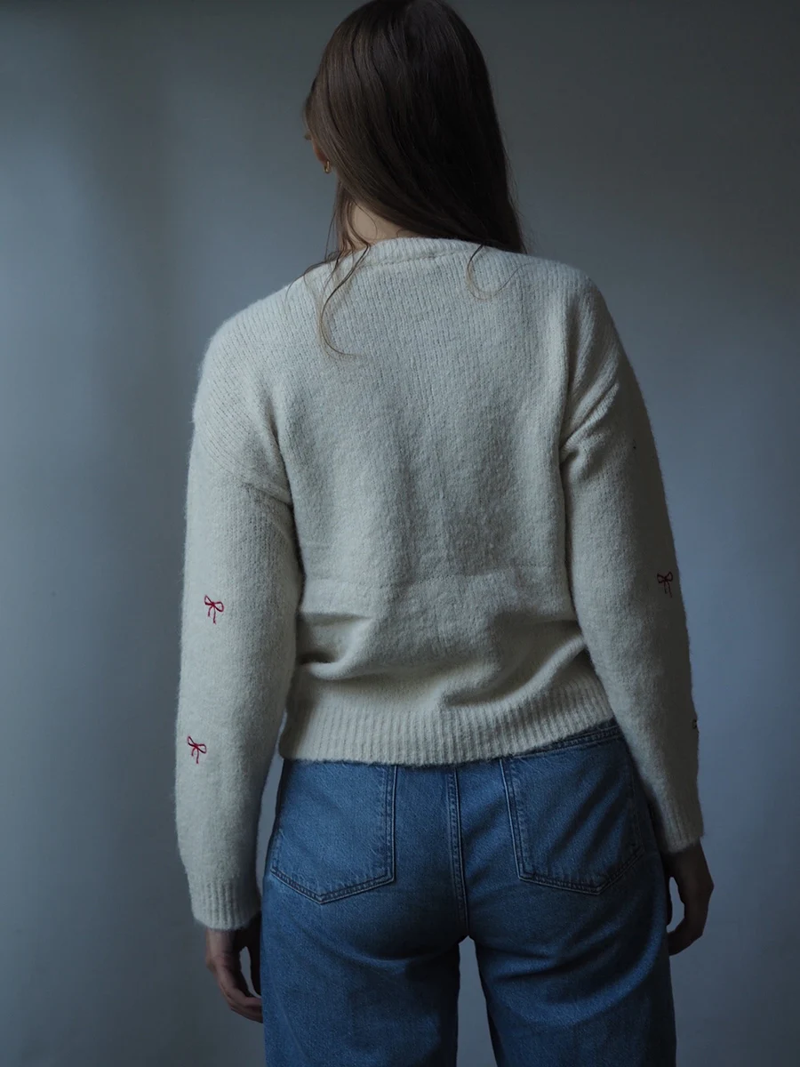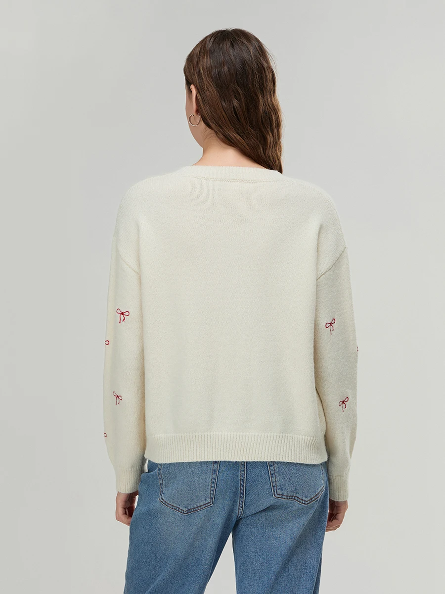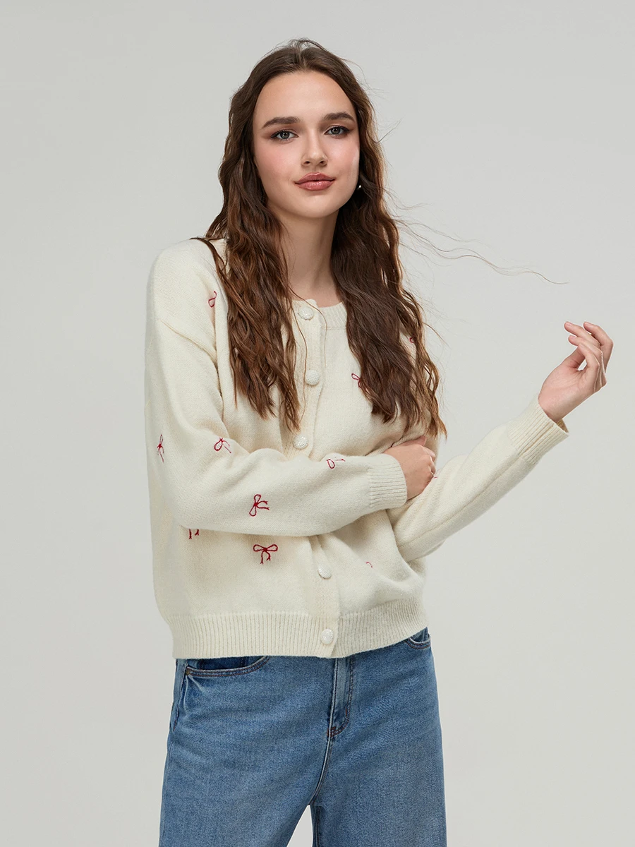 Womens Bow Embroidery Cardigan Crew Neck Button Down Long Sleeve Knit Sweater Casual Streetwear