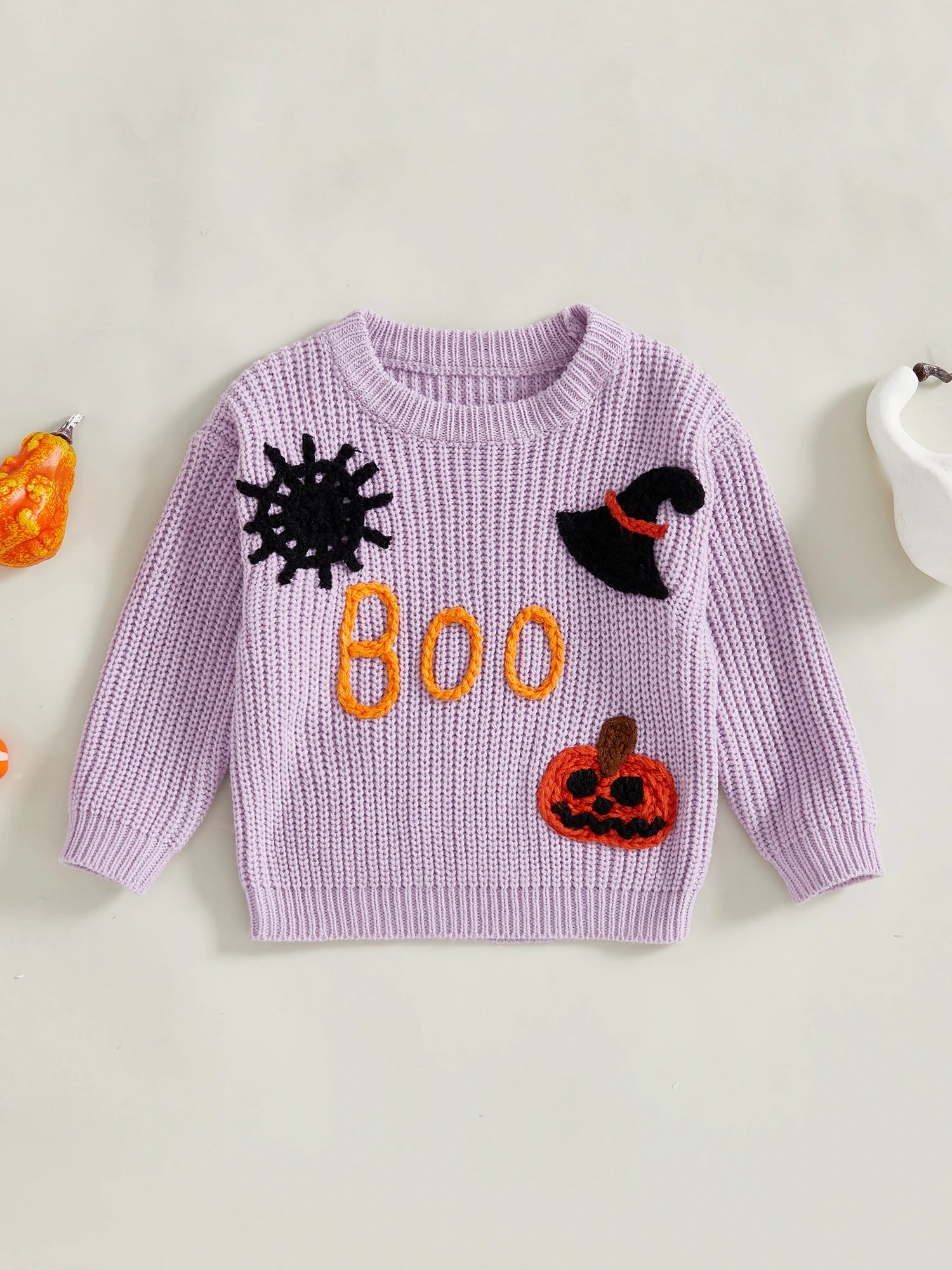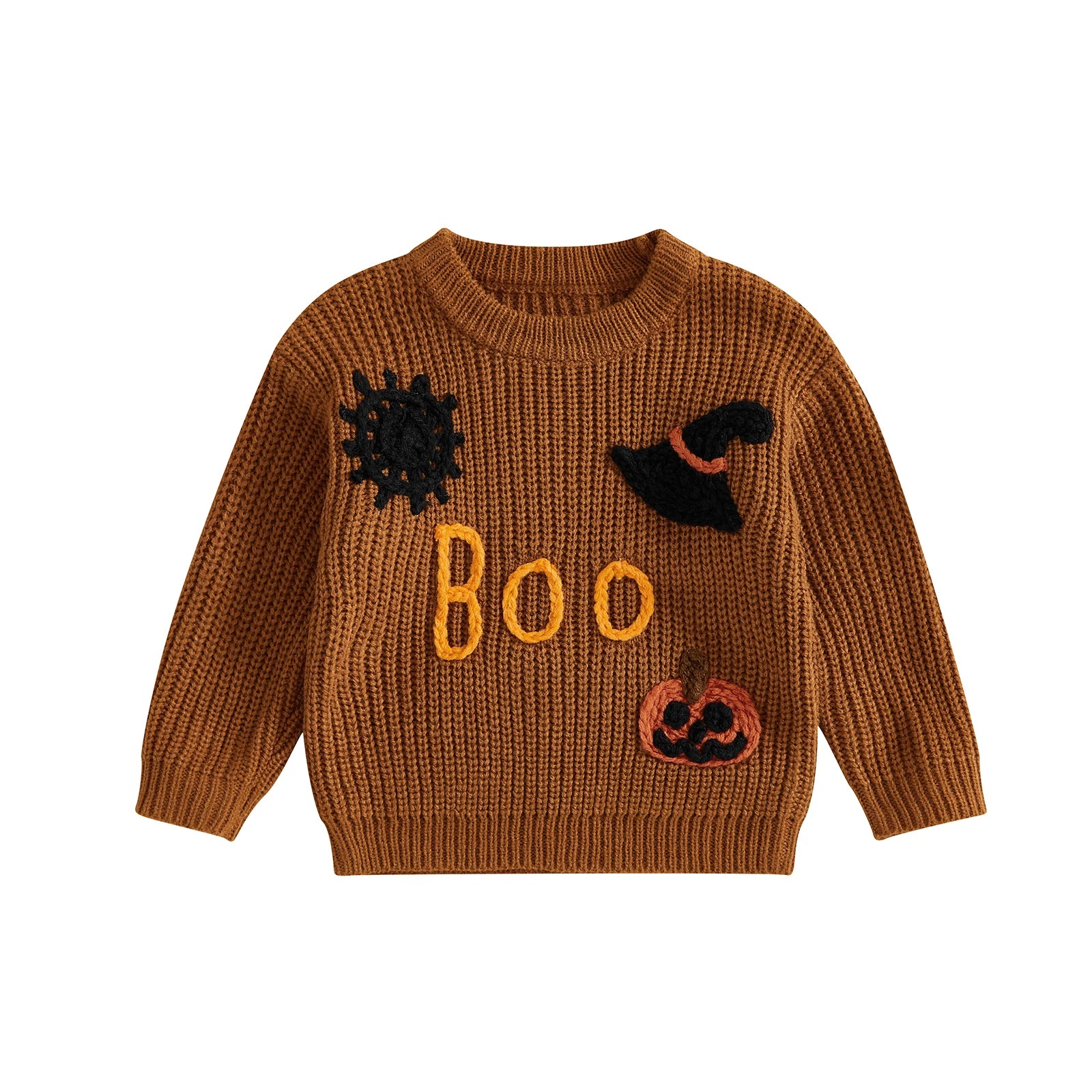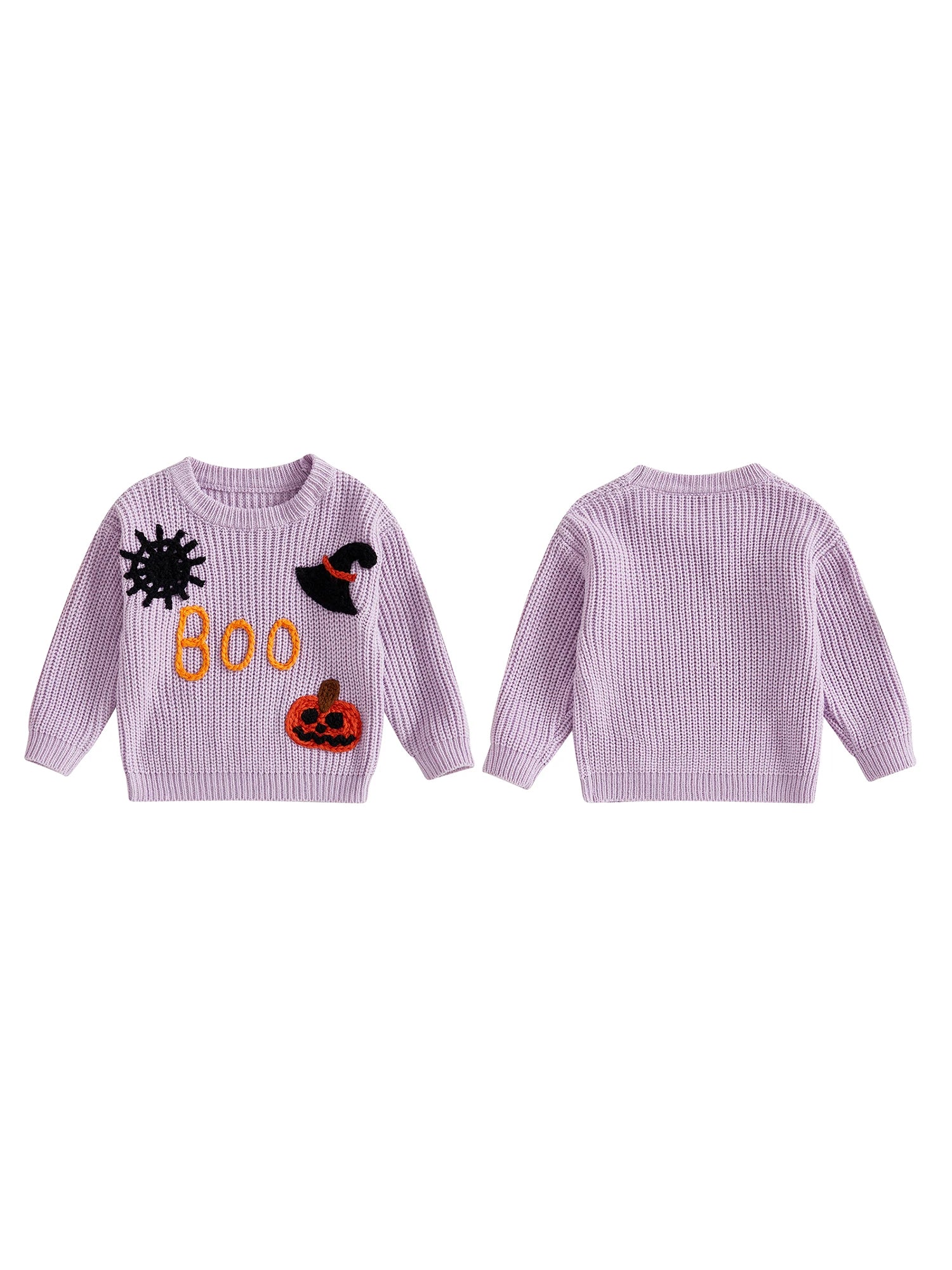 Girls Halloween Knit Sweater Long Sleeve Round Neck Letter Pumpkin Spiderweb Witch Hat Embroidery Knitwear