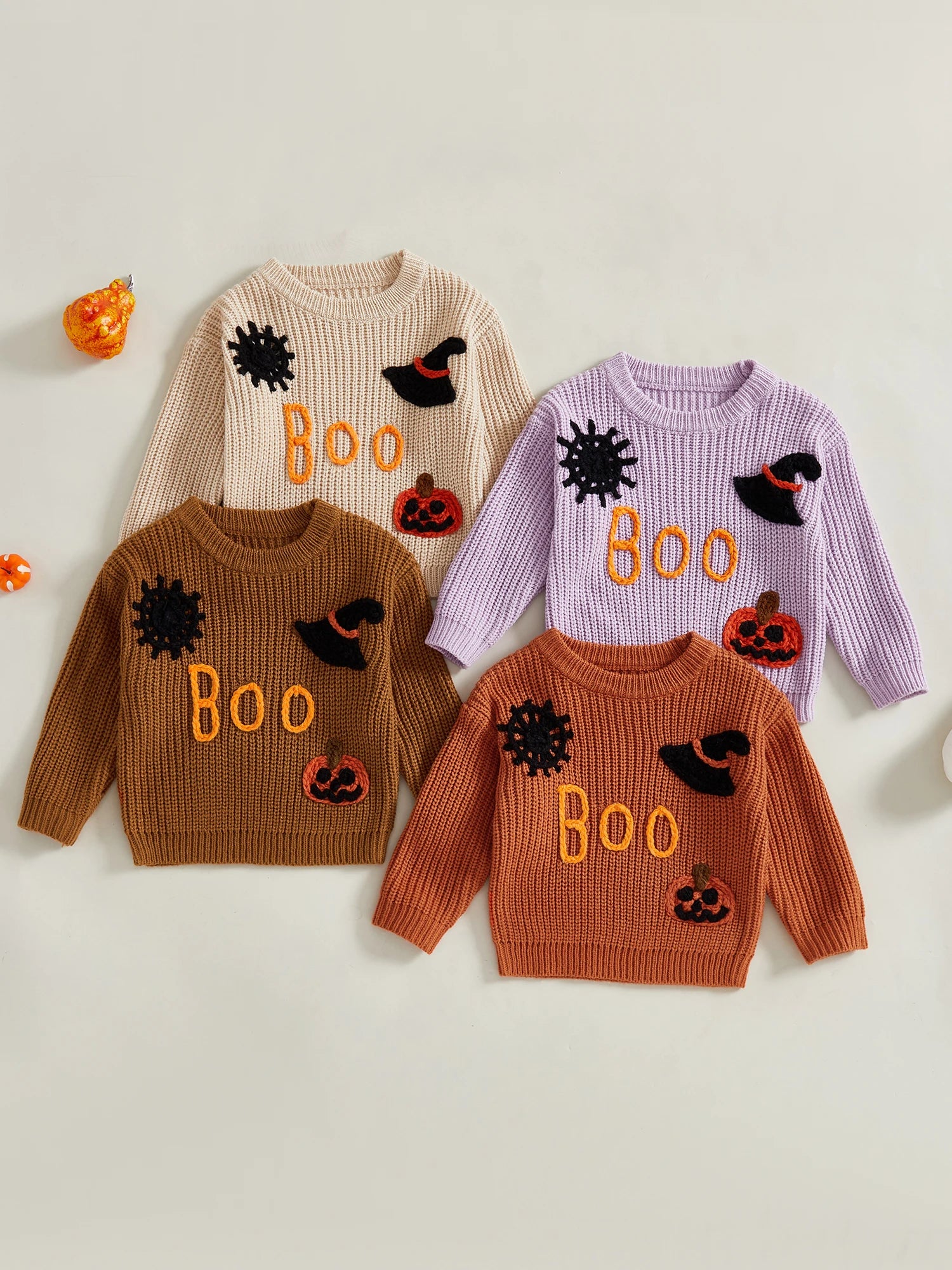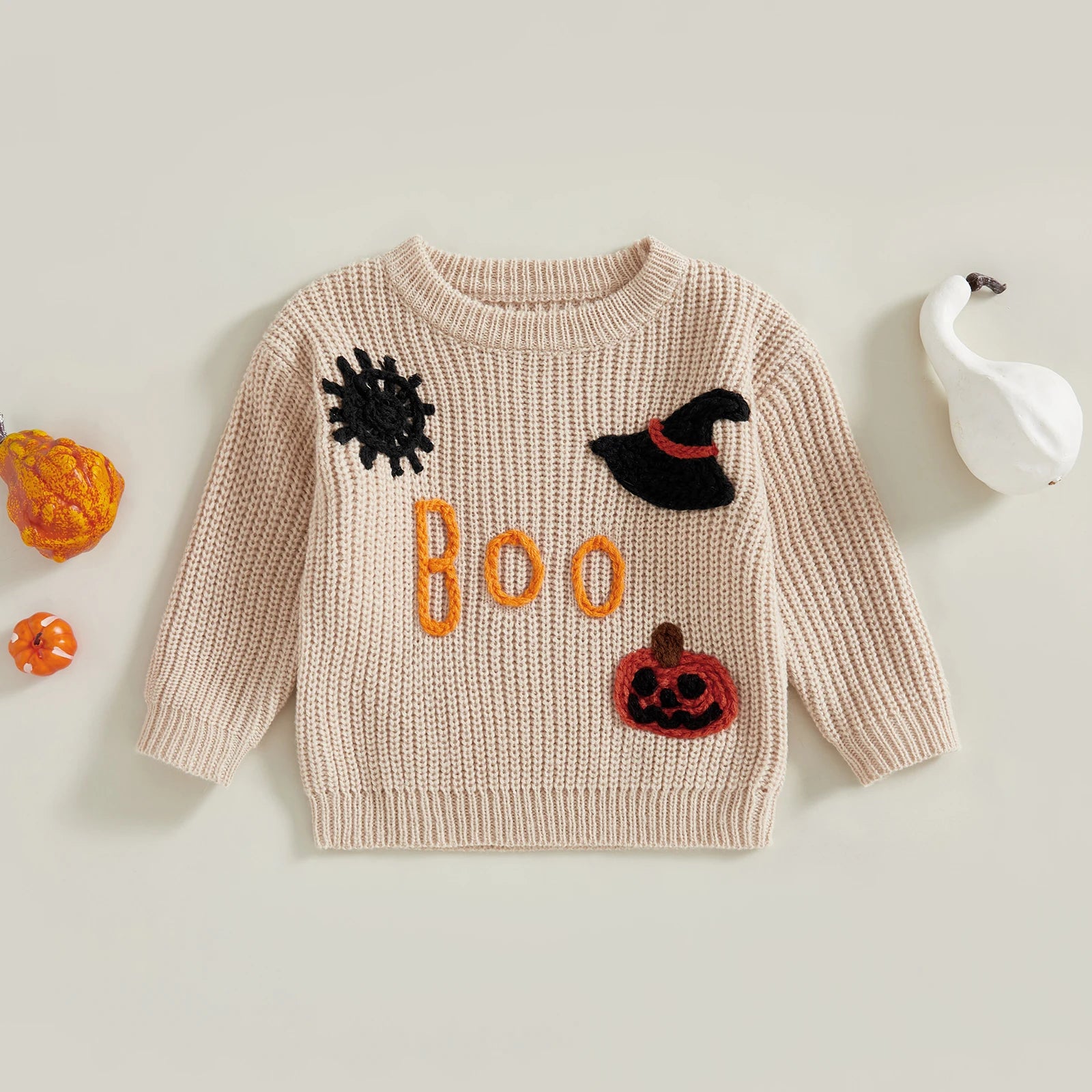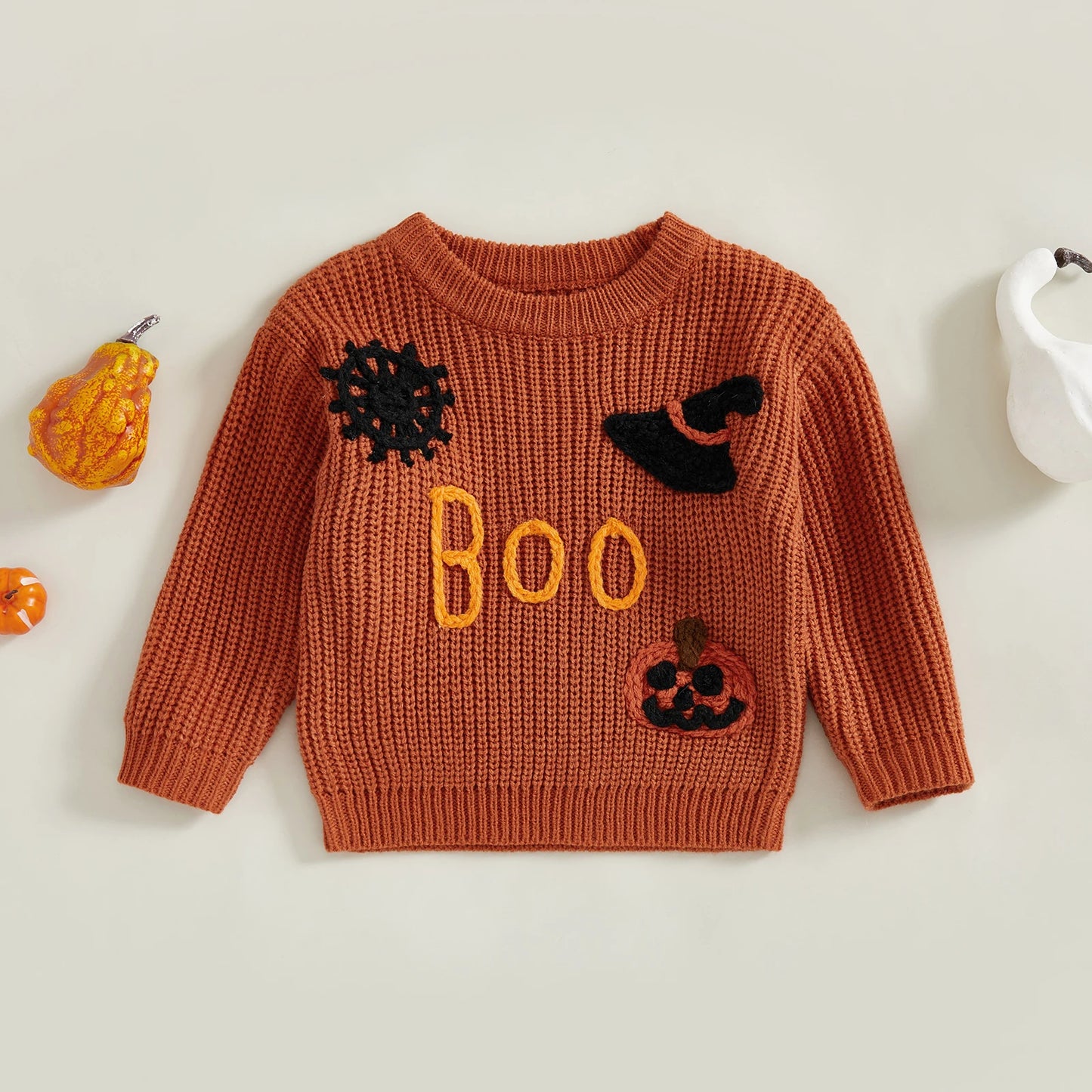 Girls Halloween Knit Sweater Long Sleeve Round Neck Letter Pumpkin Spiderweb Witch Hat Embroidery Knitwear